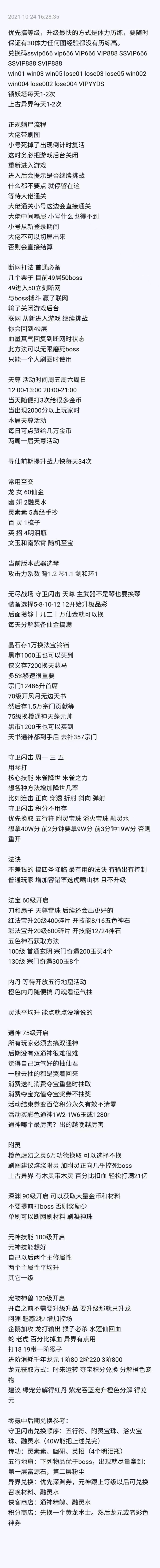 1.武器前期推荐用琴环后期琴;装备4苍雷2无涯或者4无涯2苍雷,10阶后可优先6苍雷;宠物特性与主共鸣等级越高越好最高10。2.宗门先学1(阿鼻宝典),宗门2.8.4.6法决激活天书需要,宗门7武器谱;至交优先白岚(5真经)龙兮儿(1天外陨石)幽研(2融灵水)文玉、南紫霄(5真经,4蓝锤,2紫锤随机)3.真经抄手优先武器谱,平均升不要盯着一个学。4.每天金币优先寻仙抽34次,先单抽4次,再6