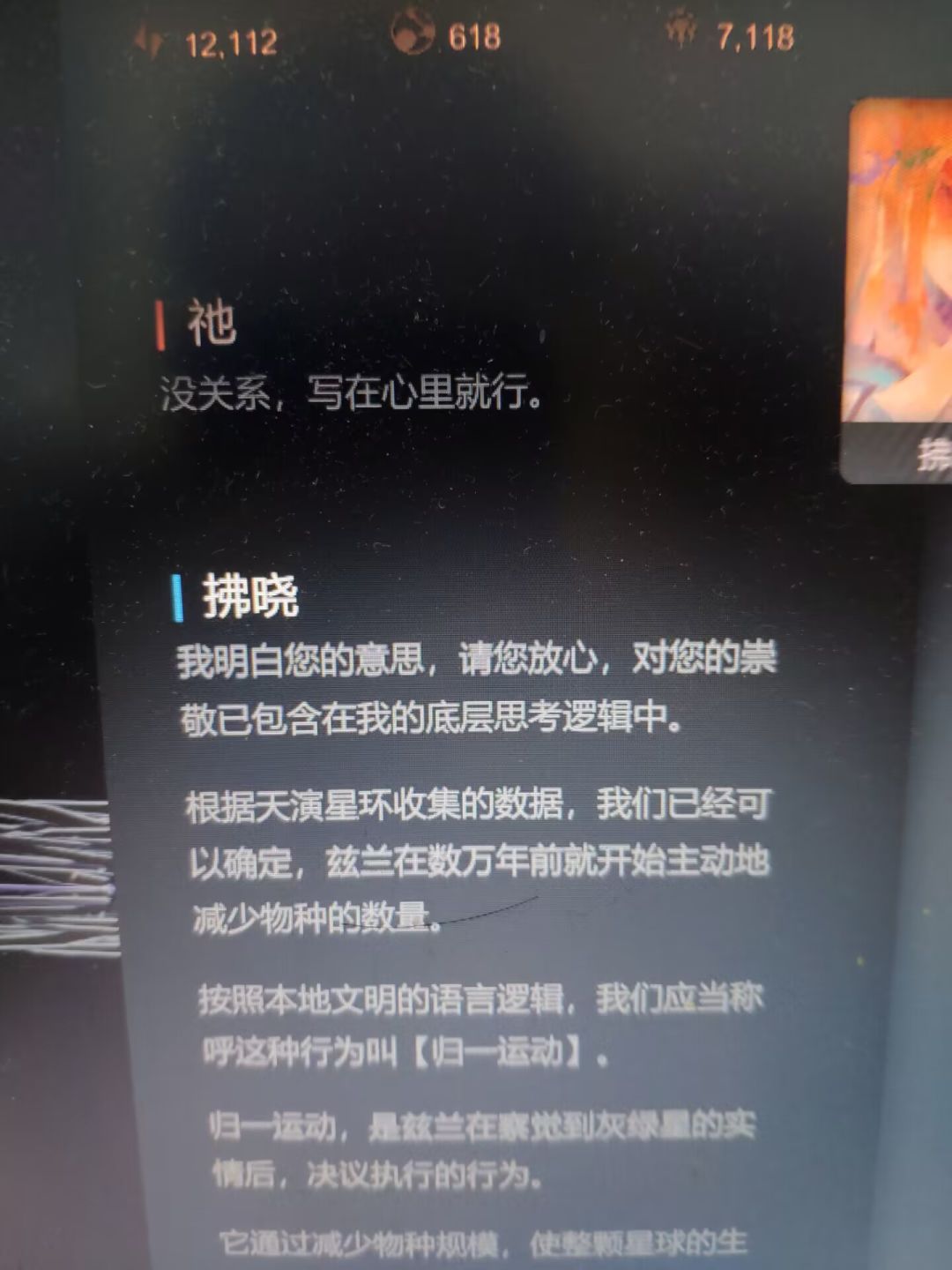 “生存,乃是文明的第一要务,但有时,不是文明的第一追求”——■■■ PHASE 1 意识重载开始 确认并行意识运作正常。 请持续点击按钮……咳!说串了嗷! 【订正者活动了许久未使用的机体,艰难地打开视野】 【回忆+1:拂晓】 在这艘舰船上遇到自己的辅航官,应当是十分令人兴奋的事情。她/祂在对我笑么?当时的我并不会意识到,这笑容像是玻璃上的水渍,再也擦不掉了。 拂晓:欢迎回来,订正者。如您所见,即便