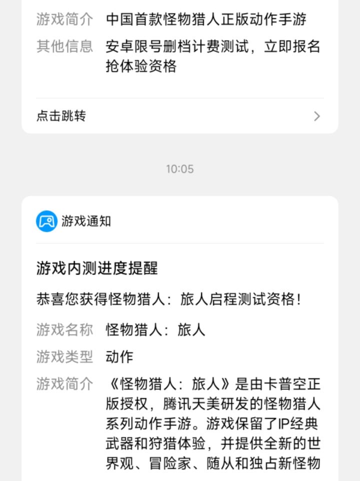 感谢老大的支持喵!《怪物猎人:旅人》「启程测试」测试资格今日起已陆续通过短信与各平台通知发放。老大还可以进入官网通过资格查询按钮,查询测试资格获取情况!更多测试相关信息,请多多关注后续发布喵~▸测试类型:限号删档计费测试▸测试平台:安卓▸测试开启时间:4月29日10:00 ▸预下载开启时间:4月27日10:00 ▸配置要求:CPU:骁龙 845 及以上系统:Android 12.