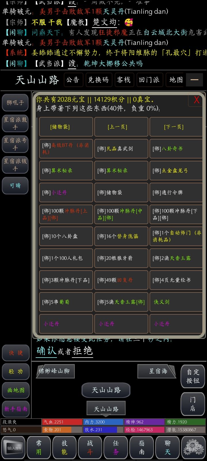 咱就是说挺好的一个服,没见过这么勤快的巫师,一直在做修改,恶意刷差评的自己动动脑子,这个服没上架之前玩家都少,大家也统一重开,少数服从多数,补偿也用,新人礼包很丰富,领了秒杀技能就可以挂师门,刚人坑mud记得找个师傅带你,mud游戏没人带的话上手时间久,元宝在每天的探索任务里面可以领很多