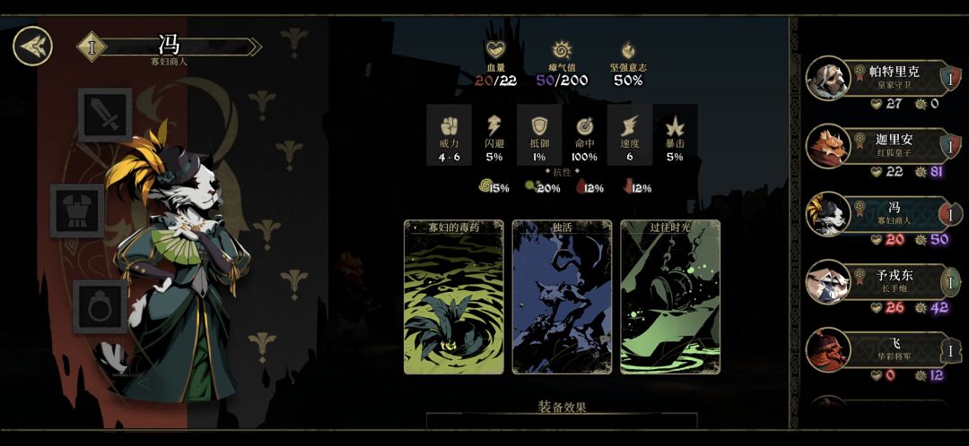 寡妇商人就是称为猫猫的角色了,看形象非常高冷,装饰十分华丽高贵,是非常实用的奶妈角色哦!虽然是初始角色,但还是非常实用的,下面就分几个方面简单介绍一下吧: 1.技能 第一个技能寡妇的毒药,对敌方3号或4号位其中一个角色造成少量伤害且可能造成腐蚀效果(跟自身的腐蚀破抗和敌方的抗性相关),因该角色是奶妈,所以此伤害技能一般不会额外升级;第二个技能独活是换位技能,可任选一人与自身位置交换而且增加两人的闪