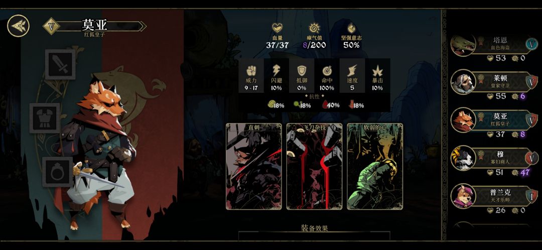 红狐皇子作为本作主角,是新手玩家通过剧情任务直接获得的角色,主要特色为暴击和流血。 红狐皇子一技能 直刺 红狐皇子向敌人造成伤害并有几率造成流血效果 此技能在前期为该角色主要核心技能,有着不俗的威力加成命中加成和暴击修正,在前期红狐皇子作为队伍核心输出时可打出不俗伤害,触发暴击时可秒杀敌方脆皮小怪!前期主要升级的技能,新手推荐指数4.5星。 视频中虽然未暴击但是敌方碎皮小怪也是难逃一死[表情_酷]