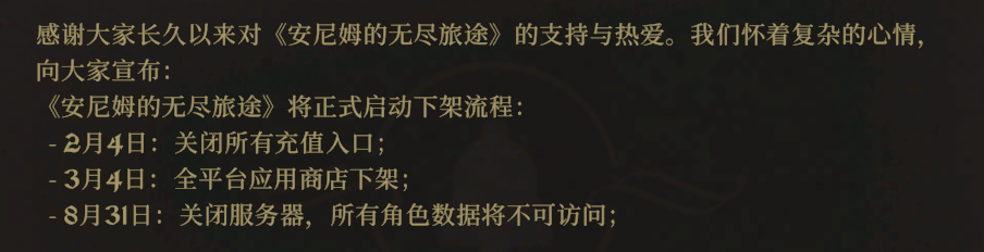 亲爱的旅者: 感谢大家长久以来,对《安尼姆的无尽旅途》的一路支持,包容与热爱。 此刻,我们需要怀着这份不舍,向大家正式宣布:《安尼姆的无尽旅途》将启动正式的下架关服流程,具体时间安排如下:2 月 4 日:关闭游戏所有充值入口;3 月 4 日:游戏将从全平台应用商店下架;8 月 31 日:关闭游戏服务器,届时所有角色数据将无法再访问。 这段旅途走到这里,有遗憾,更有满心的感恩。 特别感