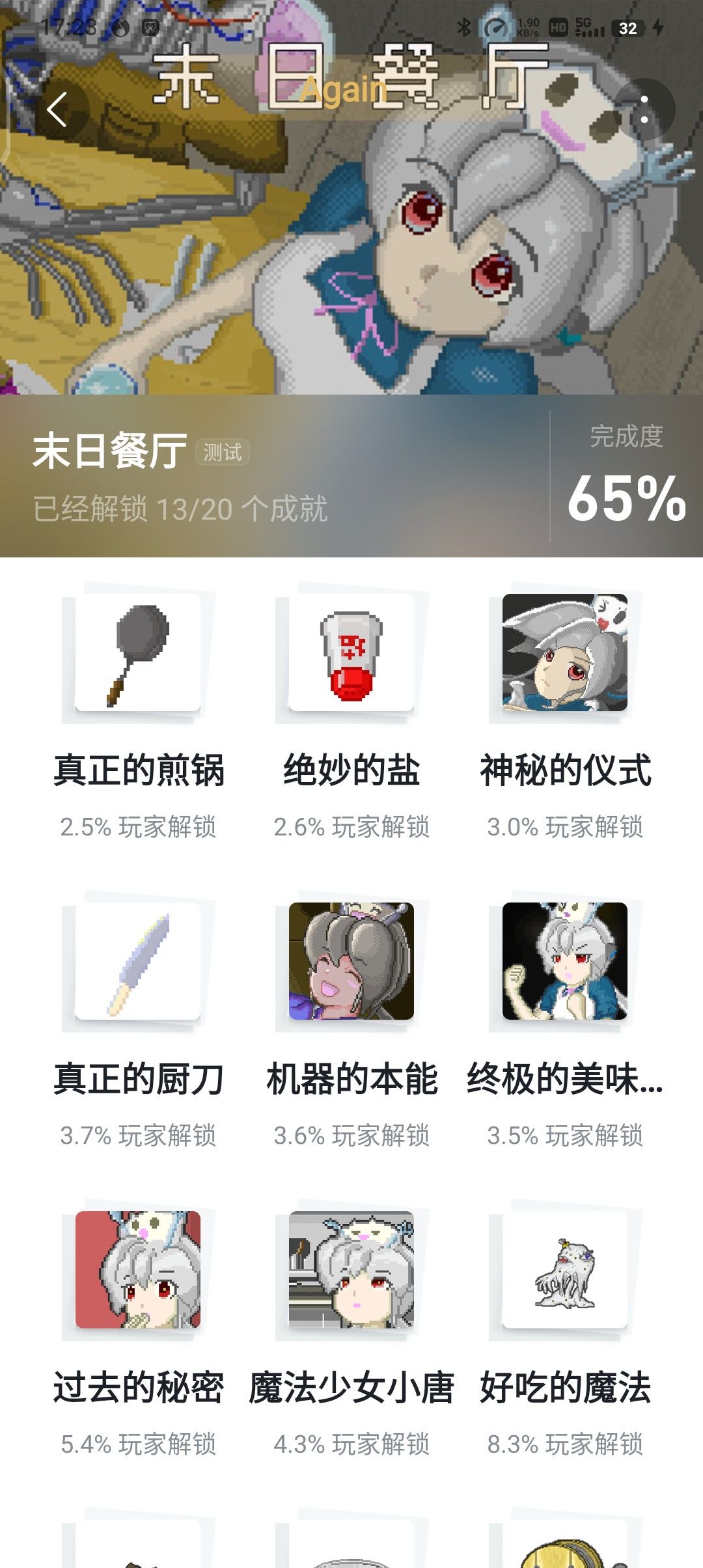 真正的厨刀,真正的肉锤,真正的勺子,真正的煎锅,绝妙的盐,这5个成就买对应6级厨具就可以获得。 单兵烹饪手臂虫,我有盾墙,导弹危机,他是鱼雷,不能受委屈,可控核聚变,钢铁之躯,好吃的魔法,这8个成就买对应食物最贵的那个就可以获得(跟厨具类似)。 登鲜造极(鲜味达到25) 终极的美味料理(一开始的人们最后一关料理完电线杆获得) 过去的秘密(常客1通关) 魔法少女小唐(常客2通关) 机器的本能(常客3