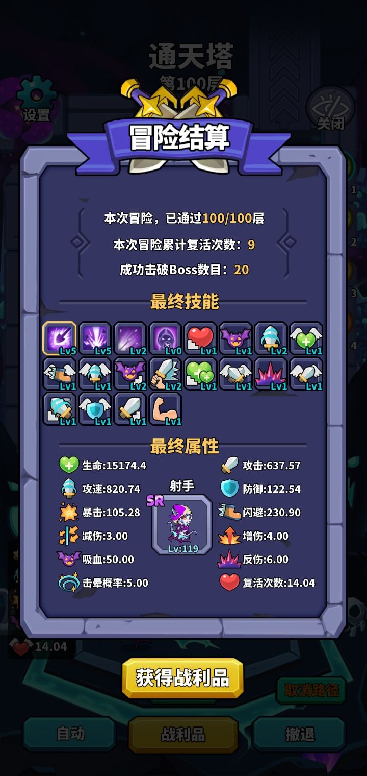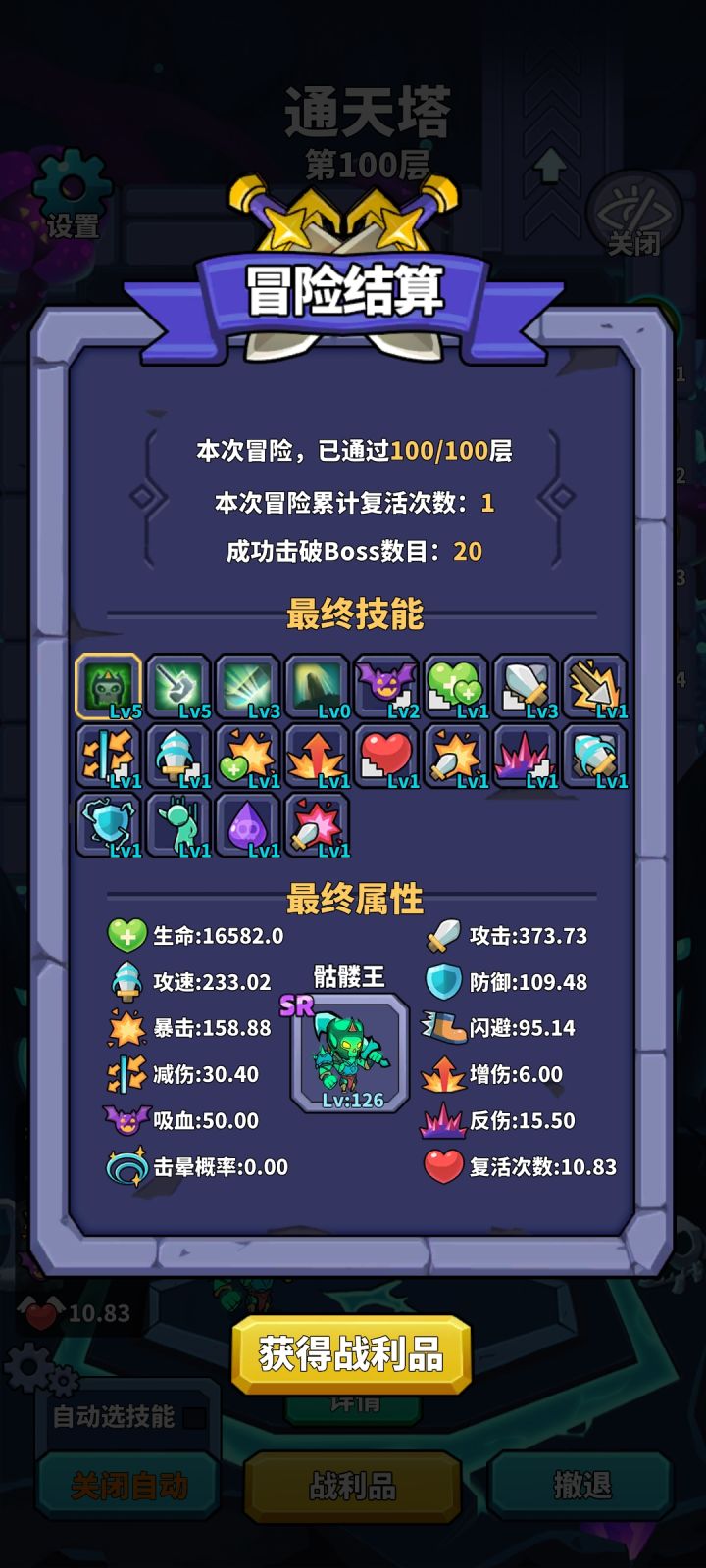 终于通关了,这一次看了很多广告,简单介绍下。每层+复活,吸血,攻击,攻速,等基本属于优先选择,生命超50%+攻击攻速,复活后加8%攻击神技,死的多加的多。其实主要是优先复活,攻击攻速就对了。防御闪避没什么用,我这属性秒过100。。