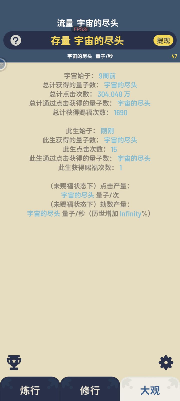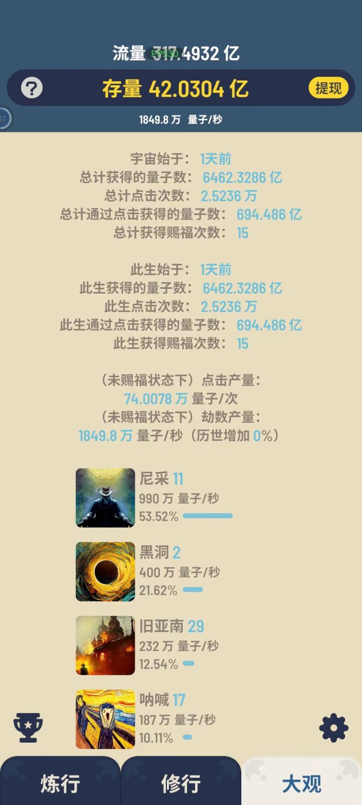 大观模块:用于观测自己的数据,你可以认为这是一个数据面板,它直观的把你的量子产量展现给你,并且对你的总游玩数据进行统计。