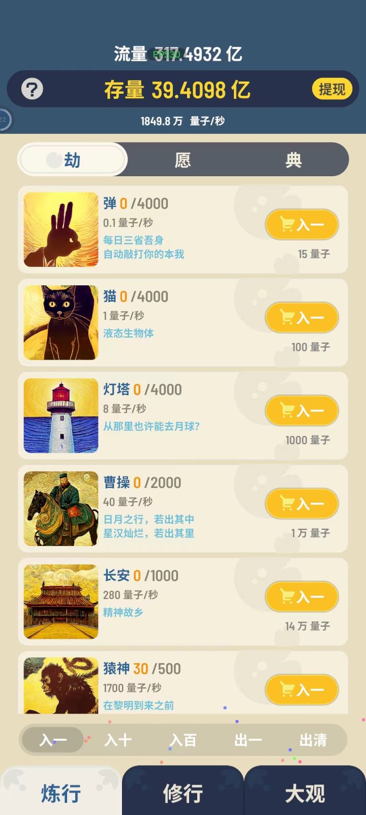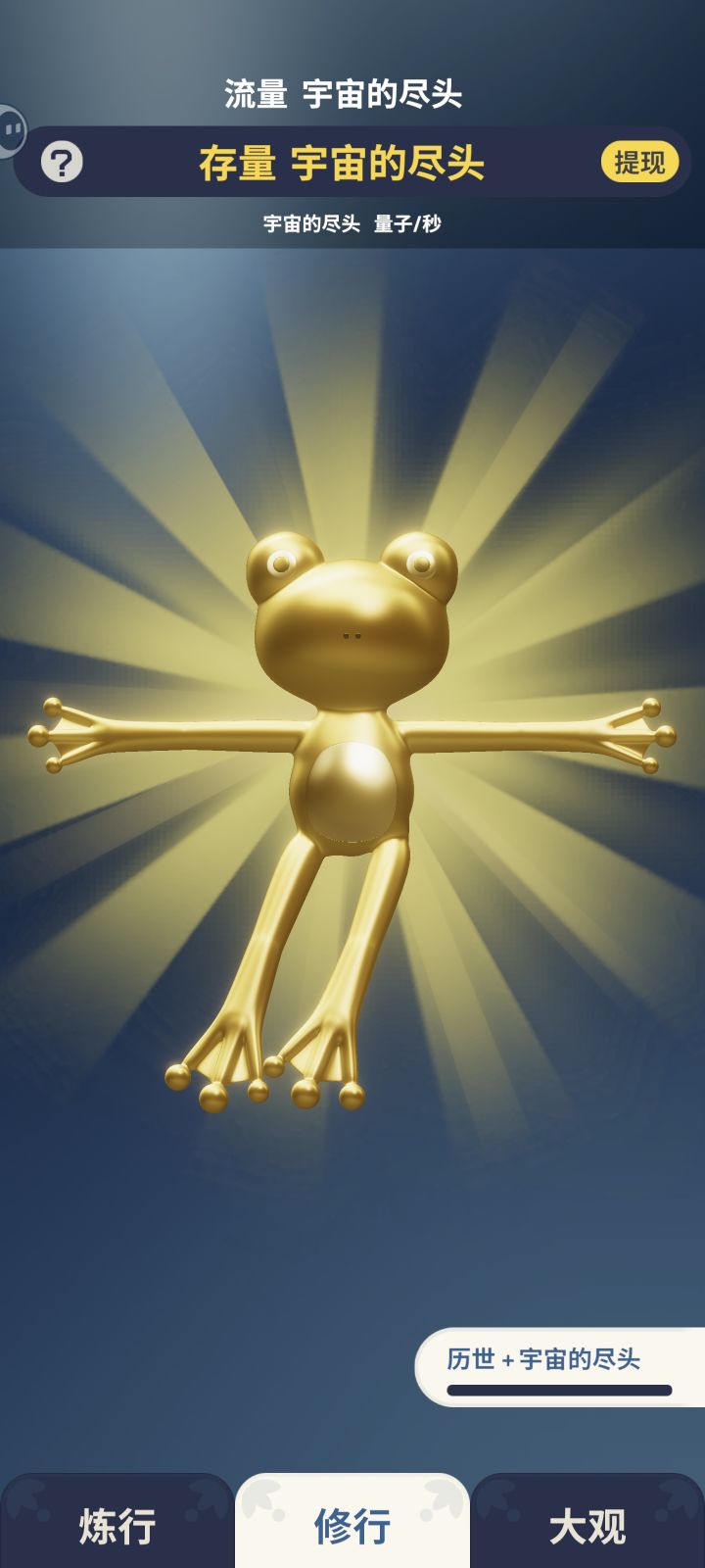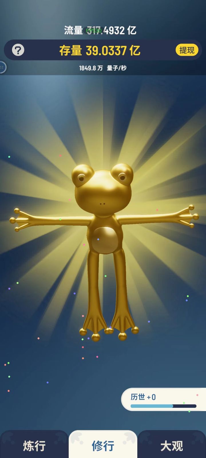 修行模块:这是你的主要游玩页面,用于点击中央的金蛙获得游戏基础单位〈量子〉,积攒量子在炼行兑换〈劫数〉,使数字增殖更快以达到快速累计量子的目的。