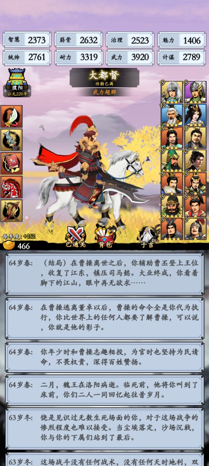 玩了挺久的,通关了两次。分享一下自己的心得首先其实云长破曹魏很简单,用标准的五虎阵容就ok下面是事件书童提问不是,背离民众,民心10岁赞同11岁全心投入12岁污浊不堪14岁从中化解,去16岁给,自己的老家,救18岁蛰伏19岁出面相助,重罚20岁正面交锋,降服周仓21岁建立城防46岁铺设木桥49岁不劝61岁告知关羽(我知道你们很容易在最后一战挂,你们有没有想过他是重骑