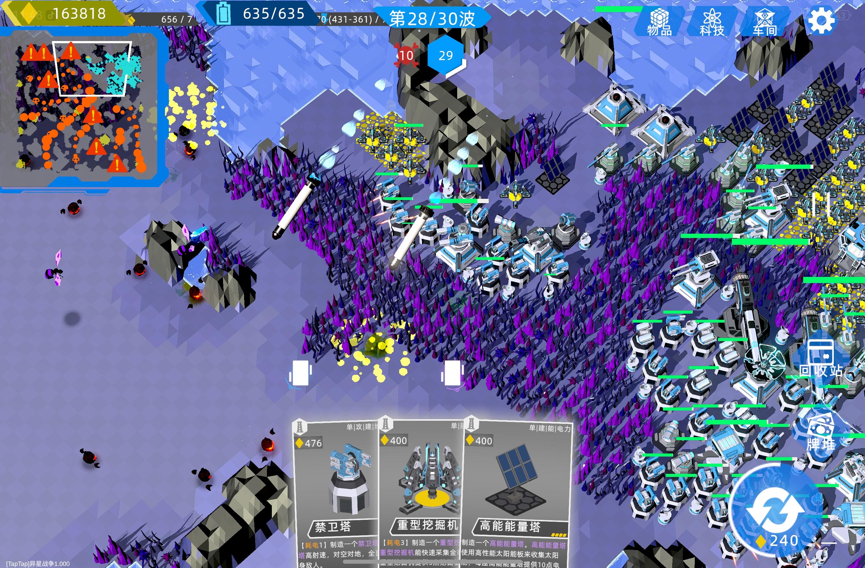 种子86944602,这个种子右下角有巨大的发展空间,左上大矿在一个孤岛上方便天罚偷 前10波的核心目标就是凑出一张点金来复制,如果其他系列的权重都不够解锁五星卡牌,10波开始时的商店几乎必定有精炼和基站,超空间矿机和能量核心能造就造,早一点滚起雪球来划算的多,能量塔和挖掘塔也挺容易出的,商店也有卖 10到20波就是不停的扩张电力与经济,如果到15波脸黑都没刷到离子炮跟狙击塔,直接去科技里买,保证