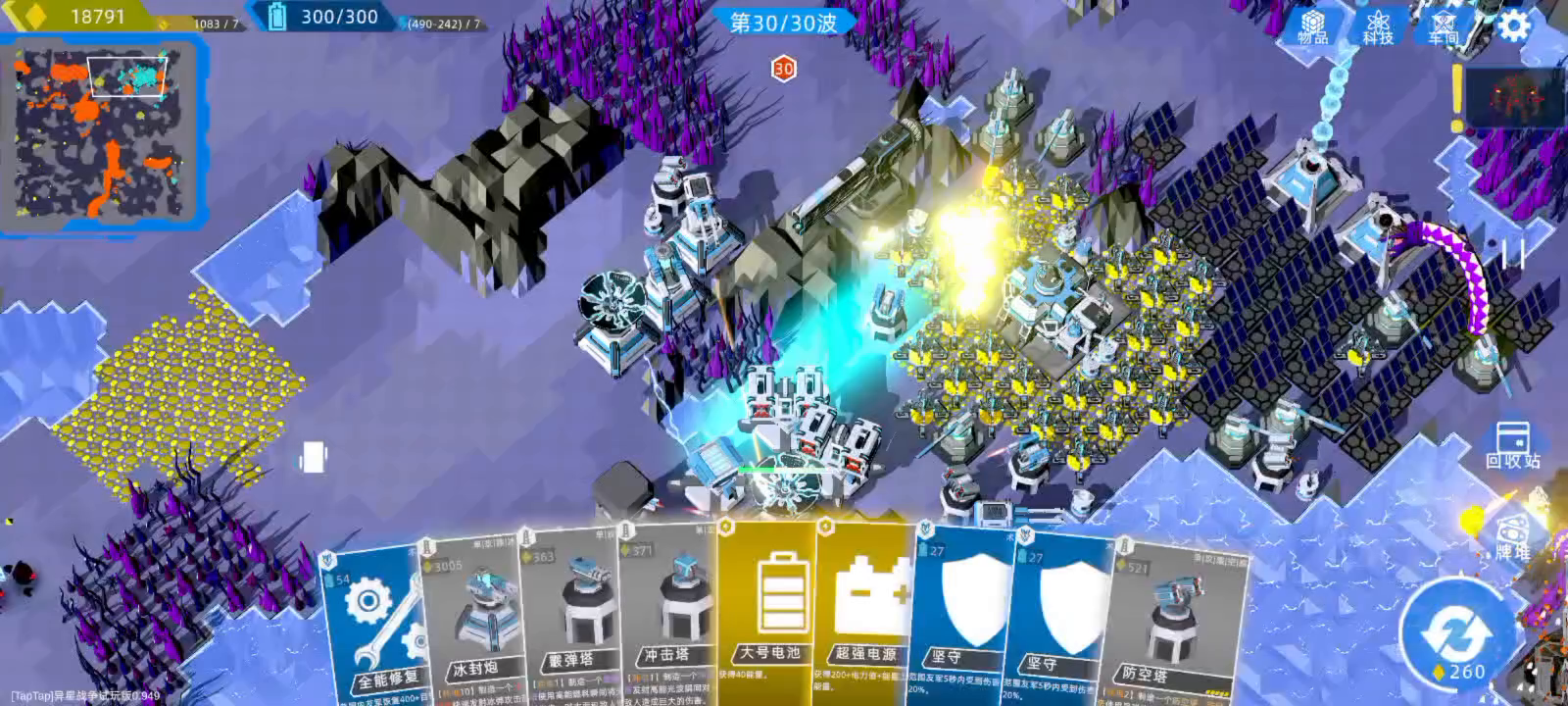种子86944602,这个种子右下角有巨大的发展空间,左上大矿在一个孤岛上方便天罚偷 前10波的核心目标就是凑出一张点金来复制,如果其他系列的权重都不够解锁五星卡牌,10波开始时的商店几乎必定有精炼和基站,超空间矿机和能量核心能造就造,早一点滚起雪球来划算的多,能量塔和挖掘塔也挺容易出的,商店也有卖 10到20波就是不停的扩张电力与经济,如果到15波脸黑都没刷到离子炮跟狙击塔,直接去科技里买,保证