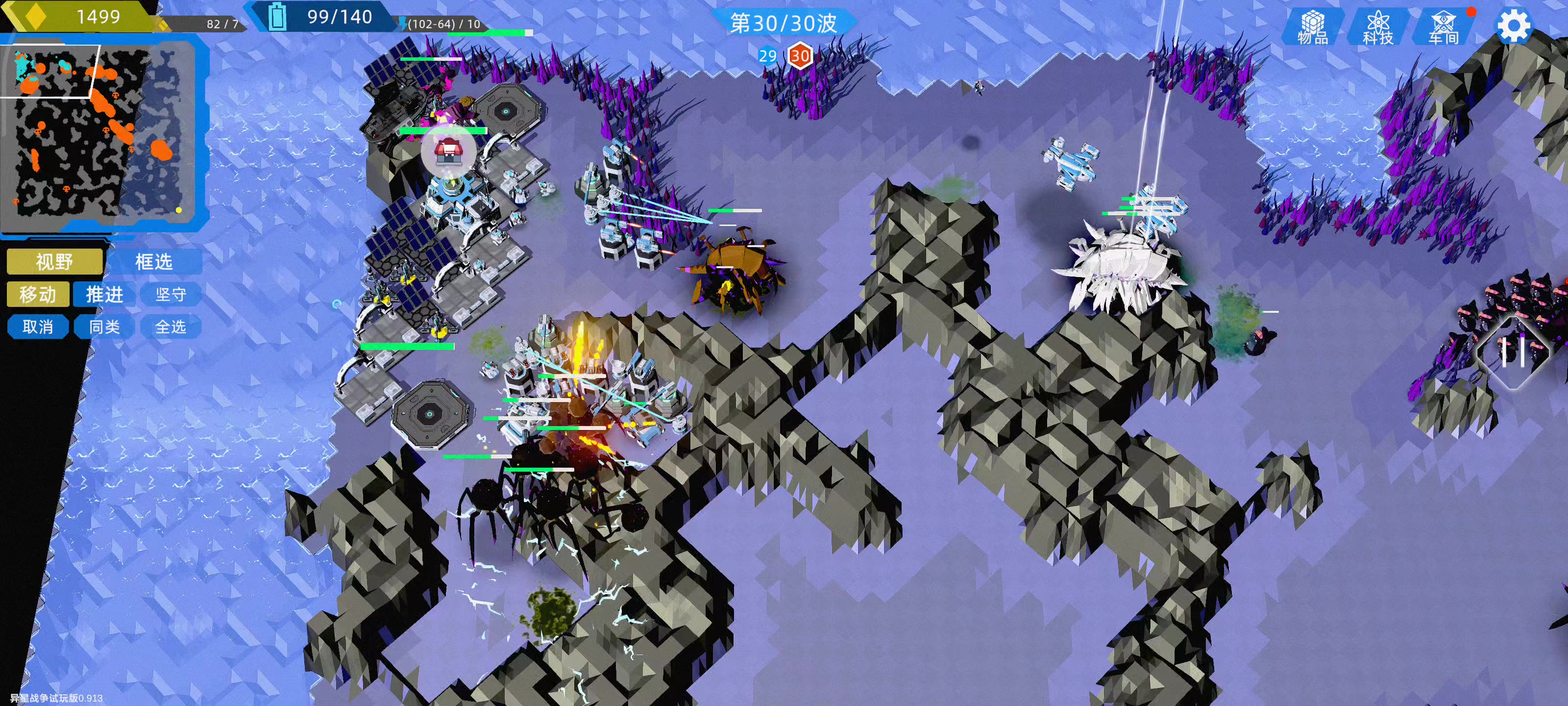 雷神两下就被打下来了[表情_捂脸哭]熔岩蜘蛛和磁暴机甲29轮就被打爆了,磁暴机甲现在眩晕还需要紫卡,而且只有0.1秒[表情_惊恐]移动堡垒改成近战吧喷火吧,其他兵老是跑前面去送。拉回来了又跑堡垒前面去了,就只有射程很远的才再后面。冰霜车控制是厉害,但是弹道飞太慢了。最大的矿爆兵流打不动[表情_石化] 还是塔稳妥。