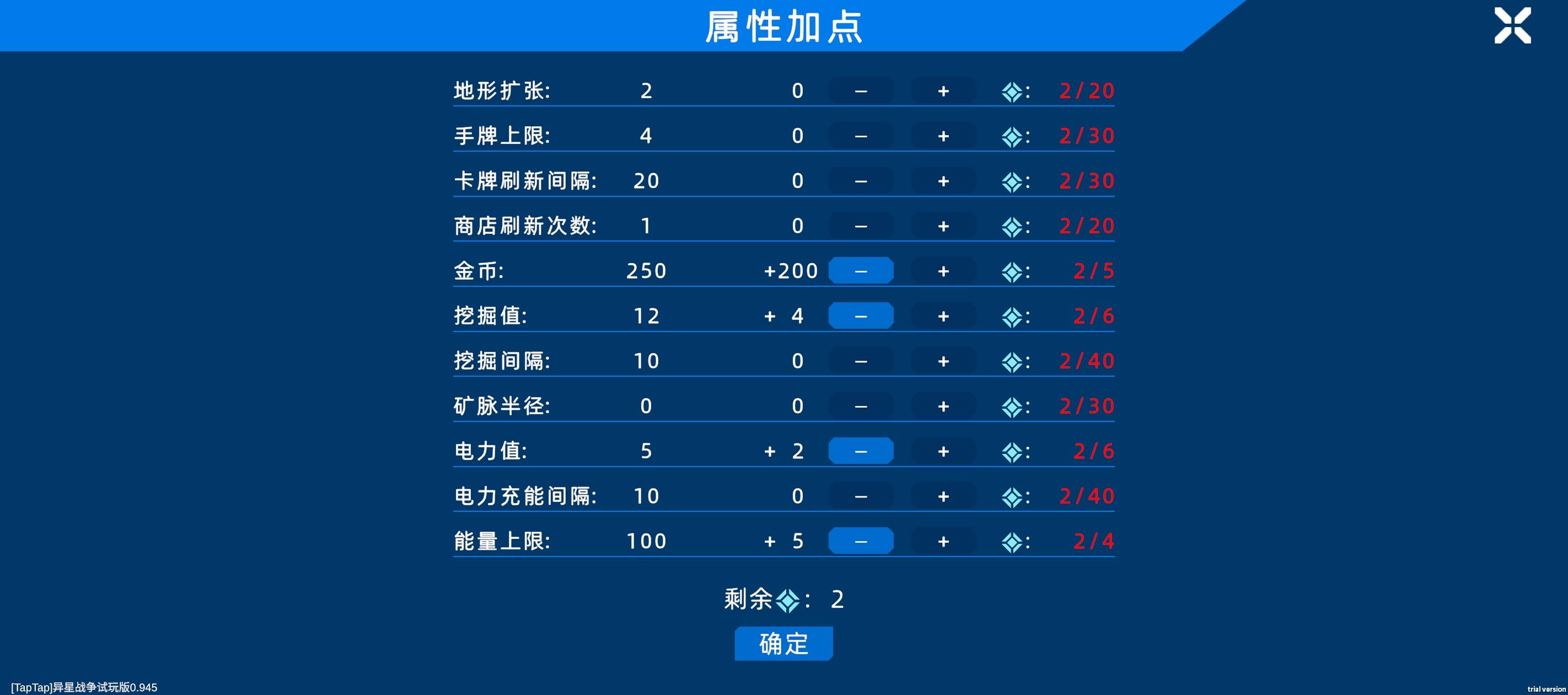 V0.9451.新增了【超空间采矿机】及其合成:可在地图任意地面位置建造,基础挖掘值40,建造在矿上X4.2.新增了【超能反应堆】及其合成:增加200电力,被摧毁发生爆炸,摧毁附近所有单位,不分敌我。3.降低了矿脉的范围,现在家里的矿脉造满了没有加成的情况下大概600多,前期够用了,需要更多则需要去野外开矿。4.增加了升级矿脉半径所需的点数。5.增加了六星单位的造价。6.增加了六星建筑