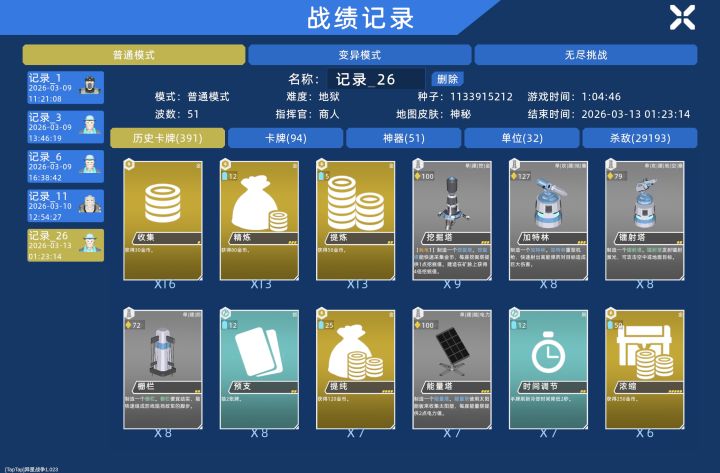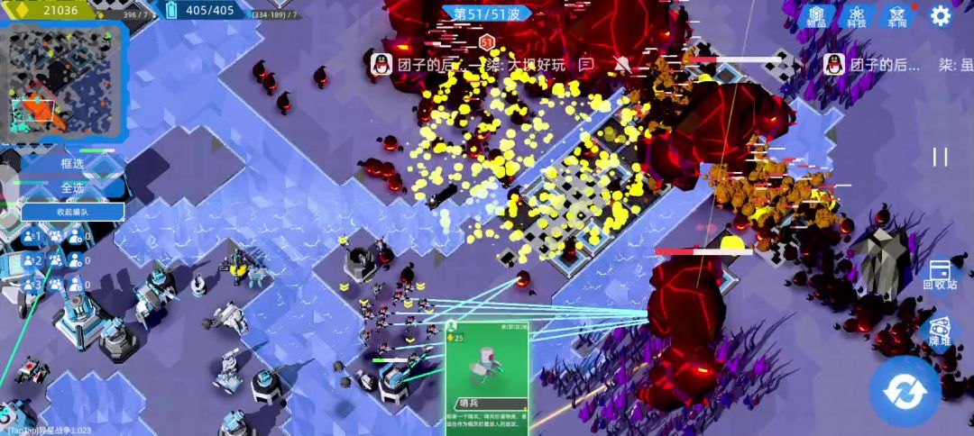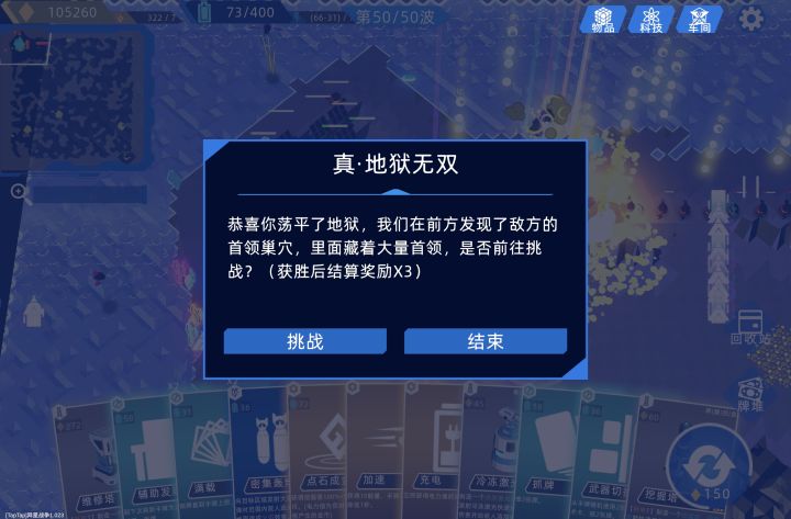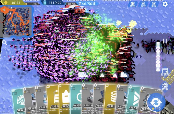 在普通模式45波次一起点了9/10变异,很快家被推干净了,之后bug出现,家一直卡住了血量,用战术卡解决了围攻的敌人。在51波准备时建造了建筑,奇迹没出现,石头人两拳轮爆了基地
