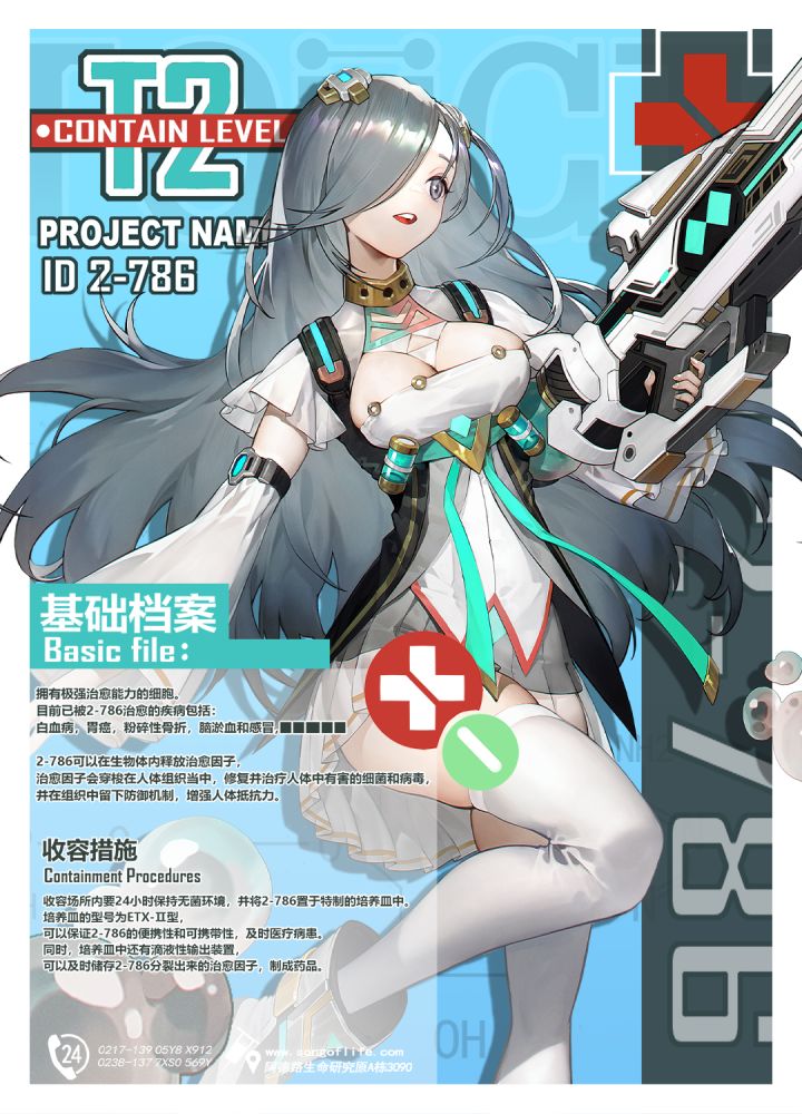 编号:2-786项目名称:纯愈因子收容等级:T2基础档案:拥有极强治愈能力的细胞。目前已被2-786治愈的疾病包括:白血病,胃癌,粉碎性骨折,脑淤血和感冒。2-786可以在生物体内释放治愈因子,治愈因子会穿梭在人体组织当中,修复并治疗人体中有害的细菌和病毒,并在组织中留下防御机制,增强人体抵抗力。收容措施:收容场所内要24小时保持无菌环境,并将2-786置于特制的培养皿中。培养皿的型号为