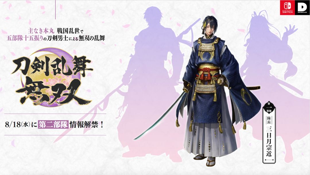 刀剑乱舞与无双系列联动!光荣特库摩旗下ω-Force和《遥远时空中》开发团队Ruby Party将合作推出《刀剑乱舞无双》,这是刀剑乱舞的首款主机游戏,将登陆Switch与PC平台,目前公开了第一部队的情报: 队长为三日月宗近,3D建模和同部队2振的投影公开,共有五部队15位剑士,8月18日解锁第二部队情报。 三日月宗近:平安时代刀匠・三条宗近制作的日本刀(太刀),「天下五剑」中最美之刀。他的瞳孔