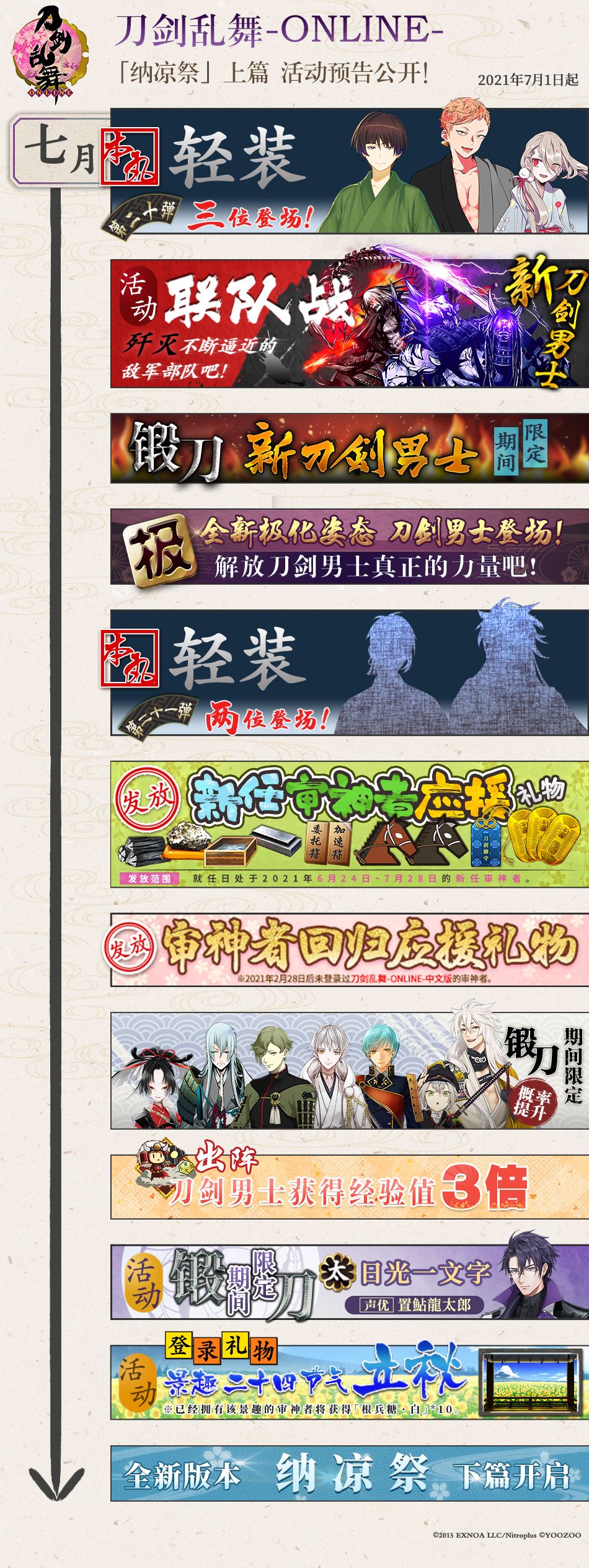 致审神者: 盛夏将近,《刀剑乱舞-ONLINE-》中文版即将开启长达两个月的全新夏季版本「纳凉祭」。 以下为《刀剑乱舞-ONLINE-》中文版2021年七月「纳凉祭」上篇活动预告。 全新刀剑男士「泛尘」「大千鸟十文字枪」即将登场!「联队战」活动开启!两位刀剑男士将以全新极化之姿登场! 「日光一文字」限锻活动再开!刀剑男士「轻装」第二十弹、刀剑男士「轻装」第二一弹、「审神者应援礼物」、连续锻刀概率提