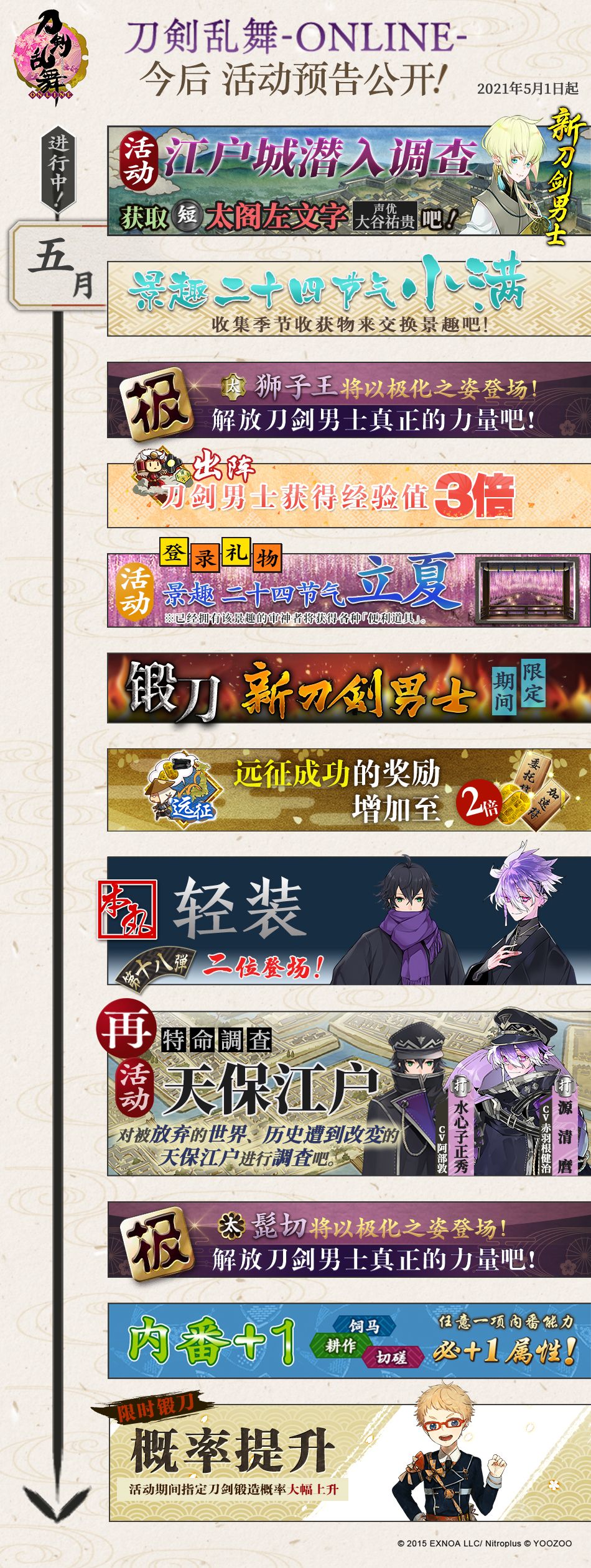 致审神者: 《刀剑乱舞-ONLINE-》中文版五月新版本即将开启。全新刀剑男士登场!「桑名江」限锻活动开启!「狮子王」「髭切」将以全新极化之姿登场! 「特命调查 天保江户」、第十八弹刀剑男士「轻装」、登录赠「立夏」景趣、「二十四节气 小满·百合」景趣等活动也将开放。 更多活动相关详情,敬请留意后续官方情报。 以下为《刀剑乱舞-ONLINE-》中文版2021年5月活动预告。 感谢审神者对《刀剑乱舞-