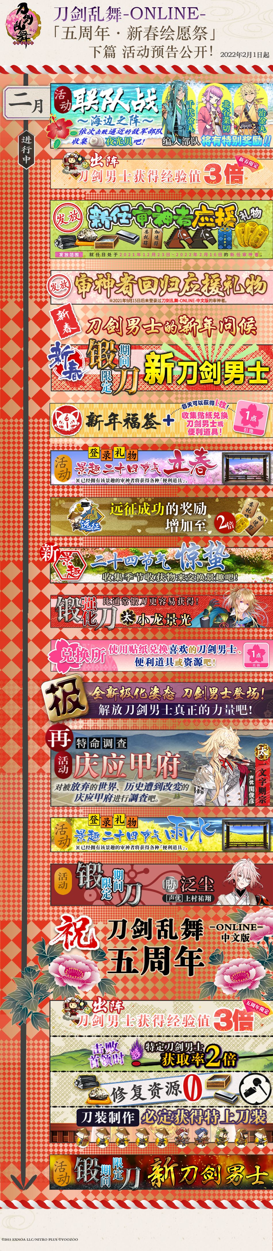 致审神者: 《刀剑乱舞-ONLINE-》中文版年度庆典版本「五周年·新春绘愿祭」下篇将于2022年2月开启。 「联队战~海边之阵~」及新春限定三倍经验活动开启!「姬鹤一文字」将登场新春期间限定锻刀活动!新年福签活动及「兑换所」开启!刀剑男士将以全新极化之姿登场!「特命调查 庆应甲府」活动再开!全新刀剑男士即将登场!「惊蛰」景趣、「小龙景光」锻刀强化、登录赠「雨水」景趣 、「泛尘」期间限定锻刀、中文