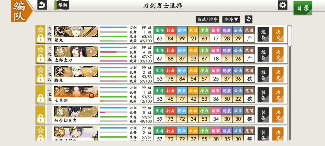 目录 主页、出阵、编队—— 锻刀、刀装、修复、合成、内番、任务—— 战绩、刀帐、回想、万屋、景趣、其他——本贴 战绩 一个比较重要的就是不要把ID告诉别人哦,可能会被盗号 刀帐 特化 等级达到特化等级后会跳出这个画面,并不是获得新的刀剑 特化结果 1.生存、打击、防御、机动、冲力、侦查、隐蔽↑ 2.合成、内番属性加成清零 3.生存回复满 4.图标出现粉红色特化标志,背景出现不可飘动的樱花 🌟特别的