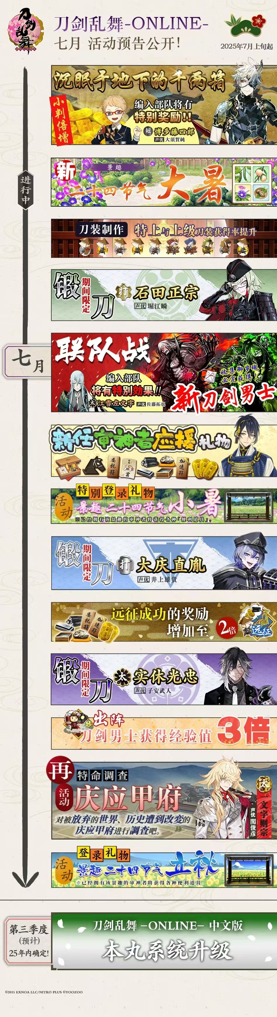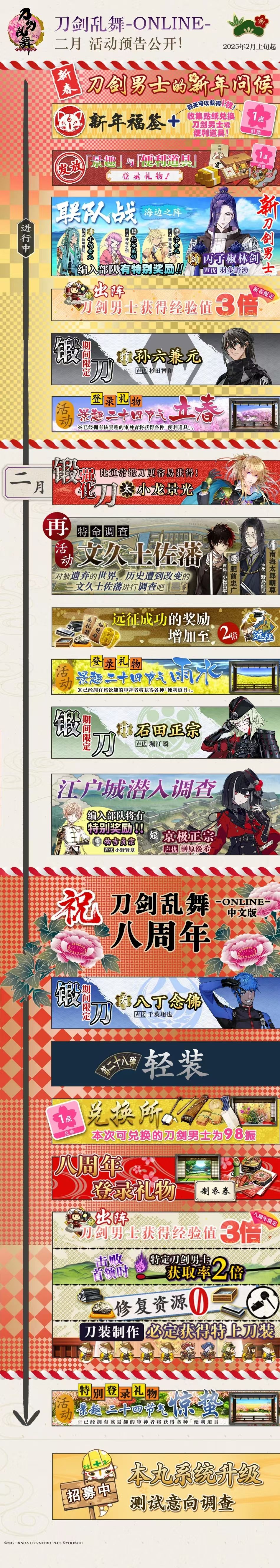 马上就是新的一年啦,先祝大家元旦快乐[表情_开心] 1月课表如下 1.聚乐第 2.1联队战 ~海边的战前合宿~ 先是合宿(纯任务和部分2~5倍经验),然后是活动副本 经验加成还是不错的,期间限定任务每天解锁一个,但是可以最后一天一次性完成,记得在【任务】中领奖励 2.2联队战 ~海边之阵~ 新刀 剑·丙子椒林剣 点送 3.新年福签 (下面是2024的,每年都差不多,登录就送,先送福签,要等8周年才