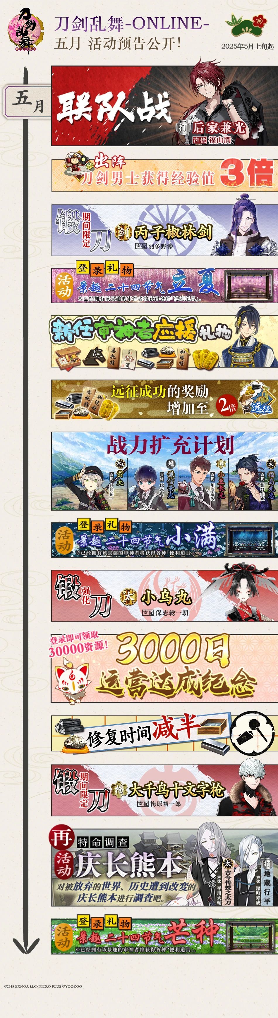 3月课表如下 1.夜花 稀有掉落 不动行光、太阁左文字、浦岛虎彻、大般若长光、日本号、小狐丸 2.秘宝之里 3.限锻 鬼丸国纲 all500 4:00:00 其他获取方式:地下城(概率)、兑换所 拔丸 all 700 3:20:00 其他获取方式:联队战(必定)、兑换所(明年) 4.极化 丰前江 5.远征2倍 6.其他 景趣 惊蛰、春分、清明 新景趣 谷雨 特别提示 记得登录呀~ ⭐惊喜掉落⭐ 八