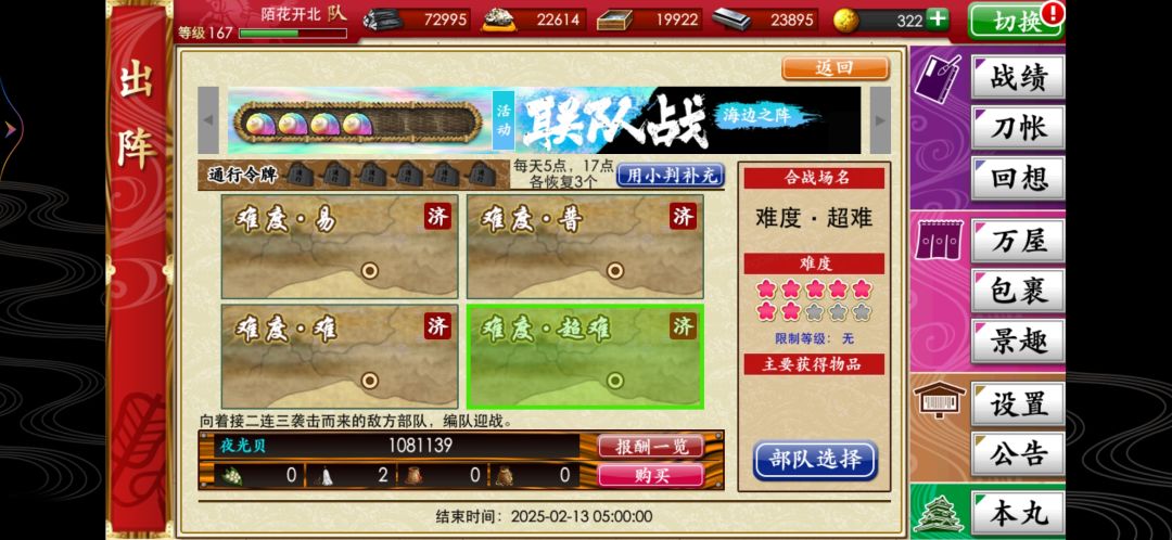 这次海联叠三倍好爽啊,总共打了108万,小判花了15w,总计掉三把大包平,三把千代,两把北谷,1把治金丸(105w掉的)。练级方面:普刀:短刀:北谷,谦信,前田60+,今剑97,(之后要带他们去7-4练级);胁差:骨喰、笑面、笼手、肥前、浦岛从20升到99,治金丸从9w拿到手现在已经积累6600w经验;打刀:10把打刀从20升99级了、南海20升到95、鸣狐20升到88、陆奥守20升到83;太刀: