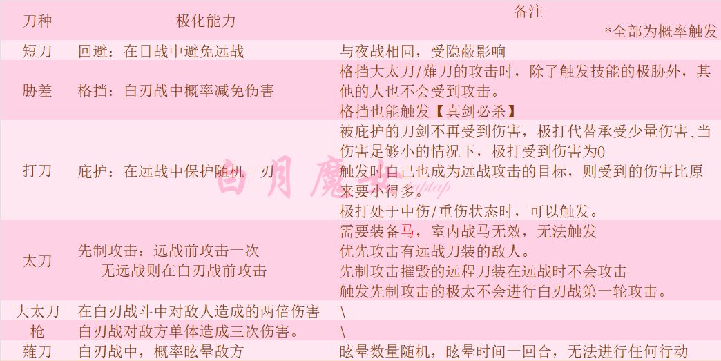 各刀种极化技能 因为更新后未极化经验可以积累,故建议薙刀可以在99级后不要极化,继续练级经验至极化60级左右时再极化 (6.21日服维护之后极打庇护范围变成自身外全队中的一个单位,且不会受到伤害,中伤重伤也可以触发)国服也更了 注: 以下极化推荐均为个人观点 表格中红色为高数值,蓝色为低数值 ◆蓝色底色标注的国服未实装,仅仅是为了让我少更新两次,等国服更新超过我这个表我才会更新 ————个人建议