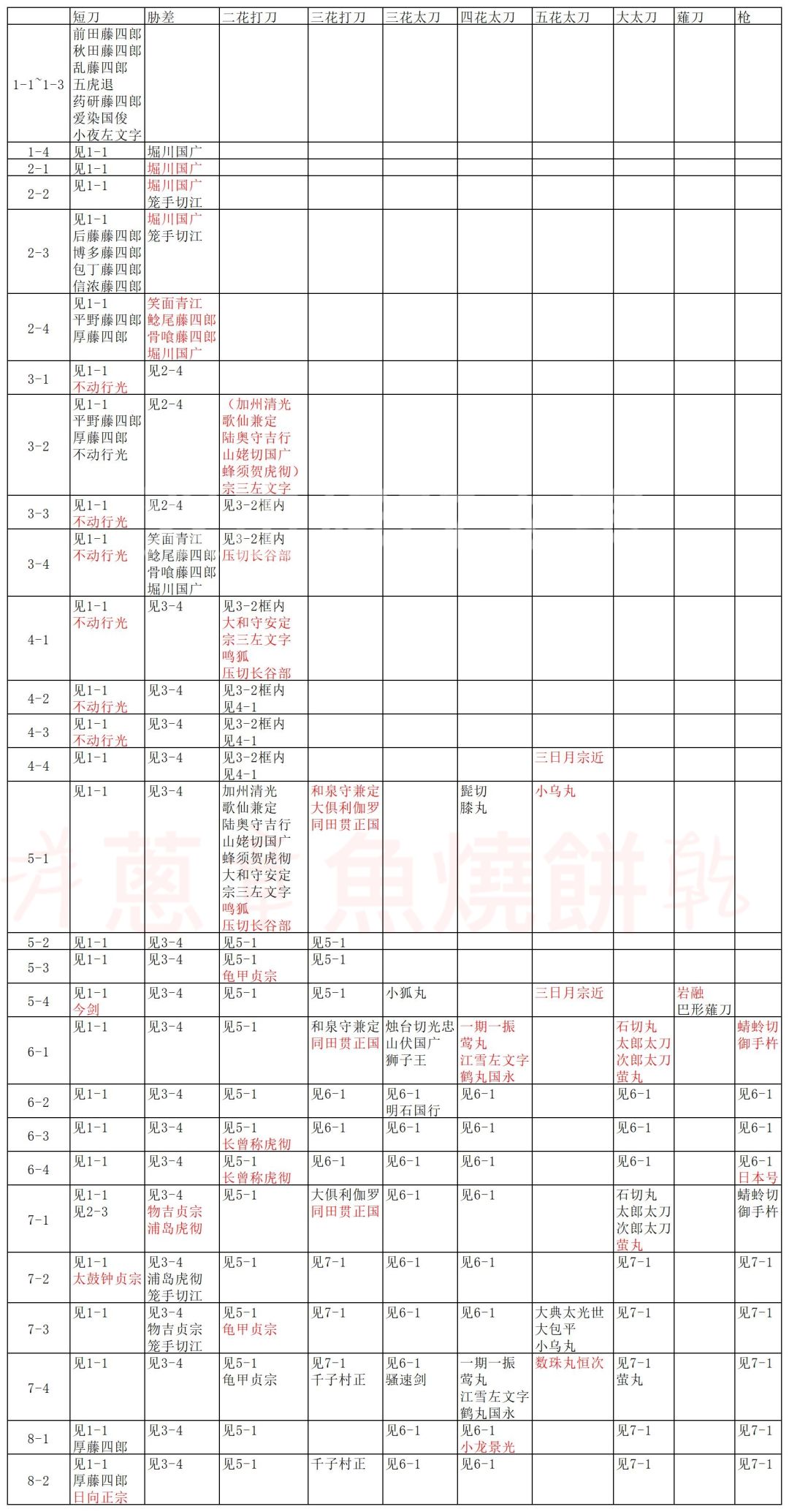 看到论坛很多人问就单独开一贴解答! 稀有掉落: 太阁左文字,大般若长光(日常不可获得) 日本号,不动行光,小狐丸,浦岛虎彻,岩融(普图可捞,锻刀炉常驻) 不那么稀有的: 老四花,蜻蛉切,御手杵等部分7.8图常驻掉落 平野藤四郎,厚藤四郎 另外,双倍经验刀如上图! 夜花每次的掉落刀都不一样,此掉落仅限国服3.6夜花 本活动为真实伤害,无需小判 仅王点会掉落刀,王点优/特胜必掉落刀 本活动难度非常低!