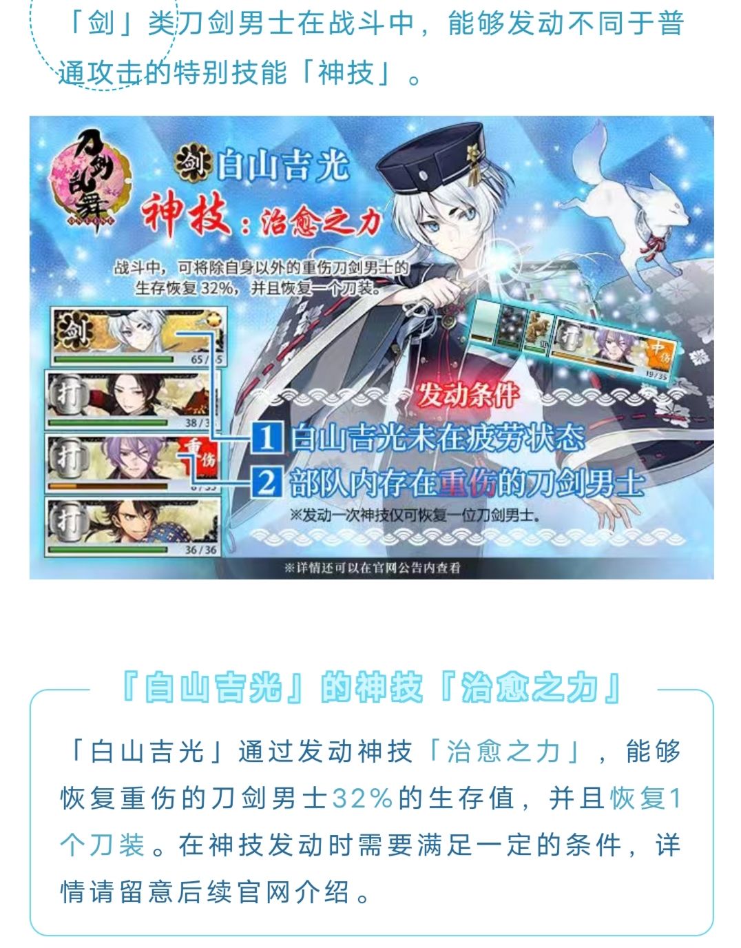 ◆虚拟伤害 需要门票(300小判) ◆队内全员经验一致,有誉有疲劳增减,但无经验加成 ◆在有队友存在的情况下,队长不会成为攻击目标(但薙刀可以攻击到) ◆队长重伤会强制回城 ◆直接战斗 无地图扔骰子无索敌无阵型选择 ◆只有最后一场掉落刀剑 (AS胜必定掉落,BC胜概率掉落) ◆掉落刀剑与SABC胜无关 ◆可以在进入下一场战斗时更换部队 ◆无法选择已战斗过的部队 (氪金道具采配可选择战斗过的部队) ◆