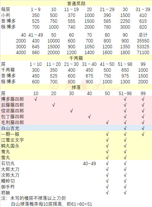 队中有【普·博多】的情况下获得小判1.5倍 队中有【极·博多】的情况下获得小判2倍 活动有一套极化道具 每层BOSS点随机掉落千两箱 ←点击跳转 (就是2l,可是下面的图都太长了 1~98层难度较低,且无高速枪 99层道中所有点概率出高速枪×1,boss点必出高速枪×1,最低伤害均为8 第一层通关后可获得传送符可以直接传送到BOSS点,故低练度建议在99层使用,可以获得99层奖励 99层地图 99