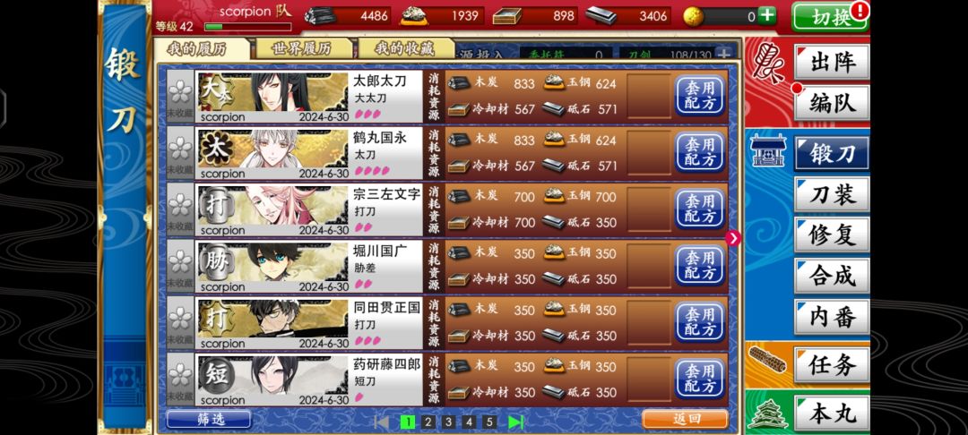 这里主要想给练度不太高,但又想捞捞白山的同事们一点点参考(o^^o) 首先我才刚刚凑齐一队极短,所以89层之后就不奢求了(是我不想捞鬼丸么,实在是没那个练度[表情_叹气]) 所以根据自己的实际情况灵活调整目标就好。 我这次地下城的目标就是:多挖小判!然后把低等级的刀们都练一练,日常地图练级真的好慢[表情_豹哭] 如果运气好,能捞到一振白山就大满足了! 我用三槽99太刀+99萤总挖到88层后就停了,