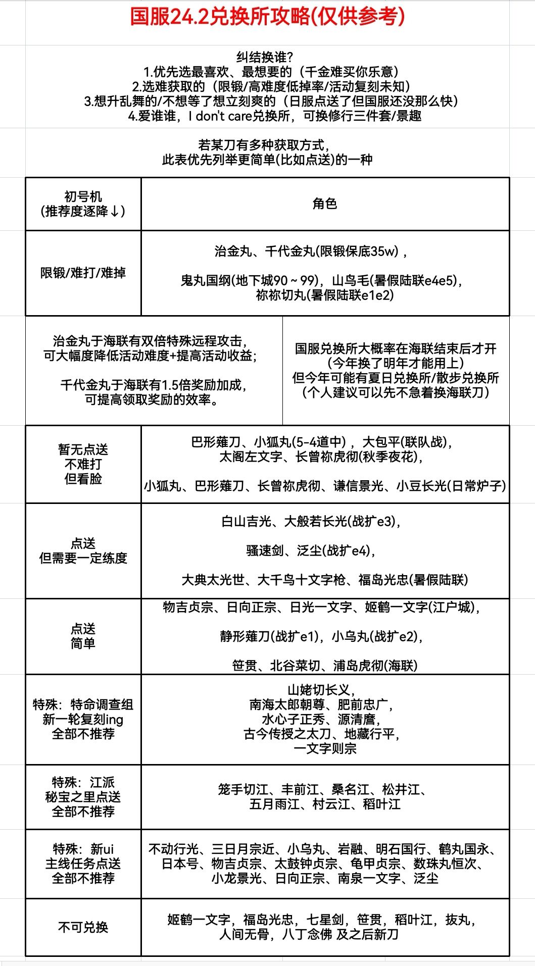 4月课表如下 1.特命调查 天保江户 (搬运大佬的链接,侵删[表情_暗中观察] 2.地下城 3.锻刀 概率up 博多 00:20:00 其他获取途径 2-3、7-1道中、地下城 限锻 实休光宗 all700 3:20:00 其他获取途径 暂无 限锻 七星剑 all700 6:40:00 其他获取途径 兑换所 4.其他 乱舞9开放 内番必定+1 刀装上&特上概率up(不建议搓刀装)