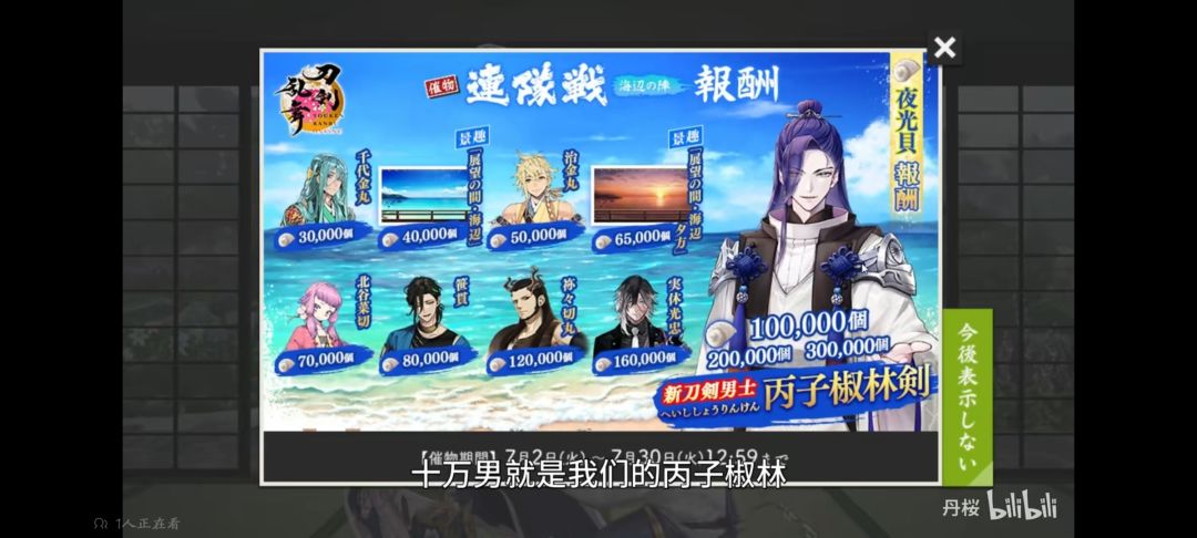 之前攒了100w小判,这次挖了30w(社畜是这样的),加上中间跳槽去扁鱼八十当钟表头刷镜牢,总之现在130w小判 之后伴随新ui的实装,异去和巧克力大作战都会实装,这俩基本门票都是900小判,所以小判之后会很缺(外加最近云生的活动掉落感人,想要二号机的更需要攒了) 加上丙子椒林的海联会送这次海联的刀(图截自b站),所以如果不是我这种迫不及待接子安老婆回家的,都可以等等,没必要肝30w,靠免费门票加