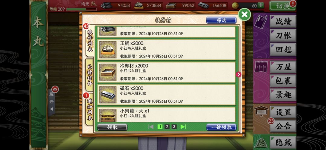 ①第一次挖地只记得是未满级极短住在88,挖了大概100w,只挖到两振白山吉光; ②第二次白山吉光×10,小判50w ,极短满级; ③第三次100w小判,极太5极大太1满级,极短挖通99,又住在99好几个小时,看到刀账红点多了鬼丸,在收件箱里发现的,白山吉光×9,江雪满乱8,御手杵满乱8。 为了接下来门票900的巧克力和异去快肝死了,正好趁着聚乐第养养神,期待丙子椒林的登场。