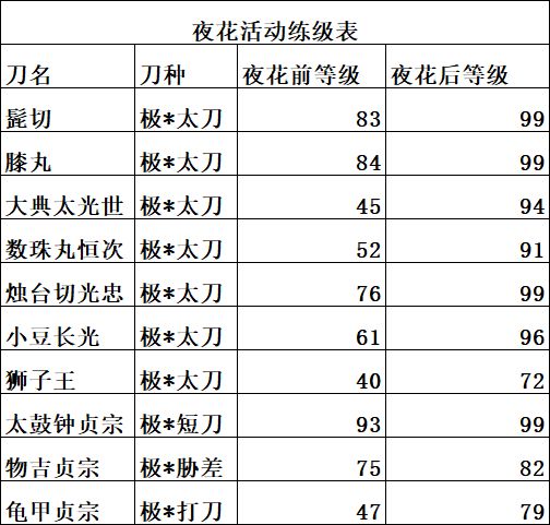 新加的刀太多了一个个对比得头晕 总之很主观地自用式总结了总体给没有初五掉落的战场都增加了初五 以下不再提及初始五刀 以及大部分战场都加了很多粟田口和打刀 以下有的后续没提但是都有检非违使掉落短刀去掉了常见的粟田口+小夜,留了今剑+四振稀有粟田口(厚 毛利 信浓 后藤),胁差增加了泛尘,打刀千子 同田贯 大俱利伽罗 龟甲,太刀明石 狮子王,三把大太刀,三把枪和一把薙刀1-2到4掉落的短刀增加了