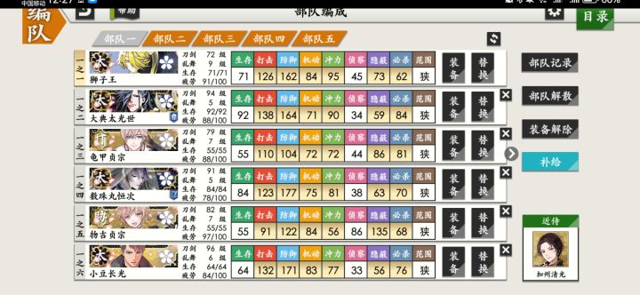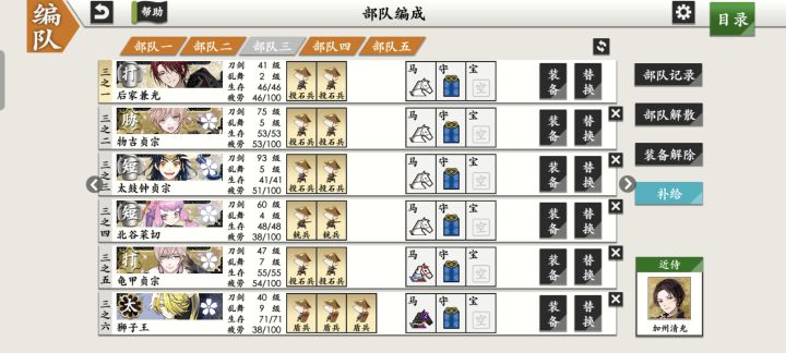 *3.6开号当前进度(3.14):57级 / 8-2 / 夜花18w+(*没赶上三倍经验但夜花练级也很爽。完全一个地方一直点点点就行,,)-*练刀练了一队短刀一队太刀,目标一队极短,前两天刚把五虎退送去极化😌💕五虎退勤勤恳恳修行中..(*实则手滑。本来想练到累计1000w经验再送的。😭😭)前两天没这么多太刀时用的是明石国行/千子村正/和泉守兼定,都99级了但暂时没选择继续练😵😵-