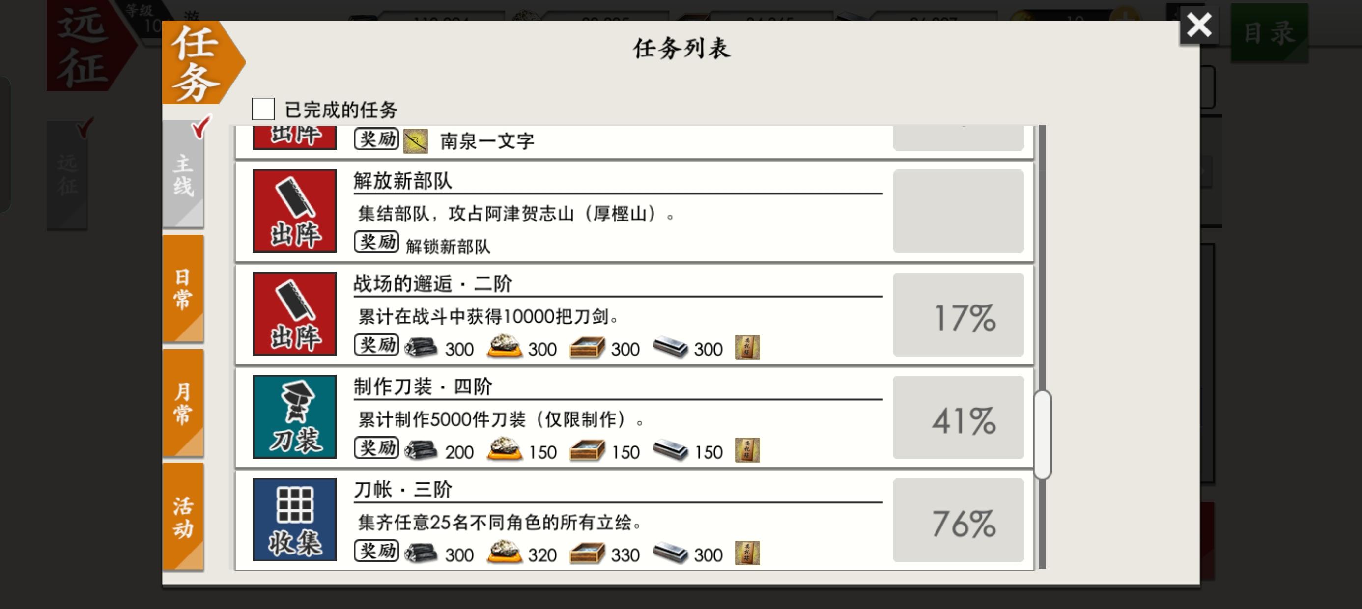 等级如图。因为想把图都开了,所以在南瓜活动里练了一些短刀和太刀,后面看到薙刀和白山好像也需要练起来所以就和大太慢慢搞了。事业心比较重,所以更倾向练级、推图。所以想问一些目前练级上的问题。社畜一枚,所以只需要点点点的话,会更好一些。还有目前的小判是17w,每天会努力远征。以上,包括三个图,是我的一些基本信息,和限制条件。问题有点多,提前感谢阅读(≧∇≦)/问题是1、七图还没开始推,感觉