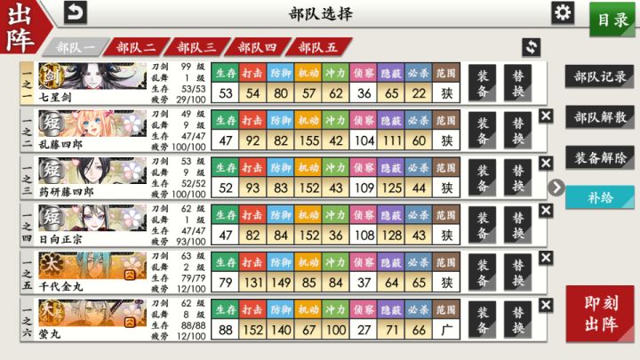 这个号是今年0202才建的,难以置信31天我的审神者等级就到了99级!我目前丙子椒林剑已经99级了。薙刀有2振,大太刀有3振,都升到了99级。太刀(包括对海联有特殊效果的千代金丸)有6振都升到了99级。打刀只把3振灰牌子的升到了99级。胁差我目前只有6振,有5振(包括因为对海联有特殊效果的冶金丸)都升到了99级。短刀除了我特地准备的一队6振未来的极短预备队升到了99级,对海联有特殊效果