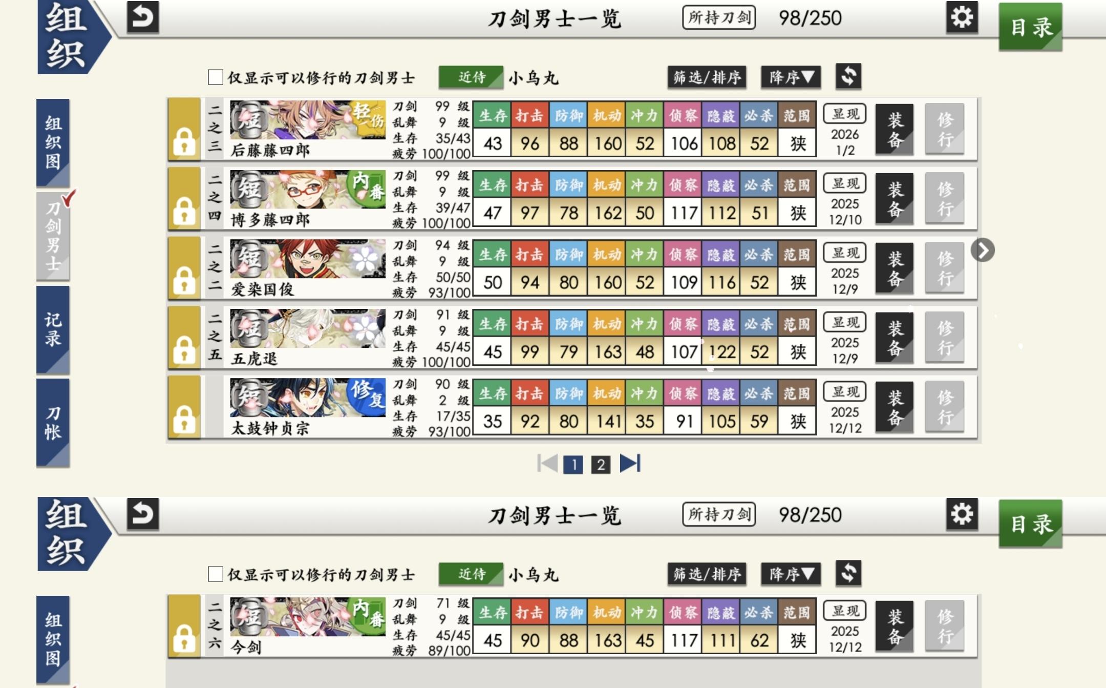 地下城婶婶肝到了256,有一队极短练到了99,鬼丸和白山之外的粟田口及容易掉落的普刀均有溢出,挖地之旅圆满结束。