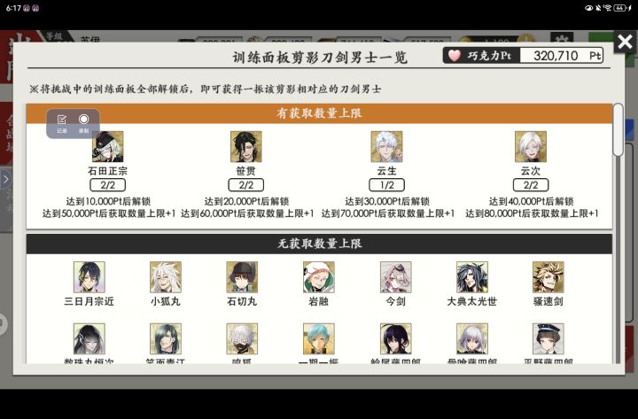大家可以参考图鉴,我没有的我发在评论区了,我感觉有的漂亮刀极化姿态没有原皮好看,不太喜欢极化皮的可以攒够第二振了再极化(个人比如三明爷爷,鬼丸,安定宝贝他们极化完我就不太喜欢,当然也有极化完颜值上升的比如五虎退,小乌丸他们)所以我几乎所有刀都还是留了第二振原皮目前缺:12把未极化(还在努力)(厚藤极化ing)3把限锻(真没招了)(云次和石田已入库)
