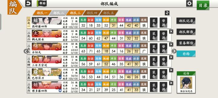 为什么第二次没有截图记录队伍安排😡我记得之前有相对完美的配对了。核心一藤四郎➕爱染➕今剑,轻步金铳弓盾兵二打胁国广虎彻兼定,轻骑投石兵。薙刀轻步兵重步兵,大太轻骑重骑精锐兵不用大调,在一基础上轮换,或者上二队现在都没啦,还得重新调整。头还疼着,更难受了,打完门票,上级一发入魂千子,无了。为了远征刷花4h,搞死了。