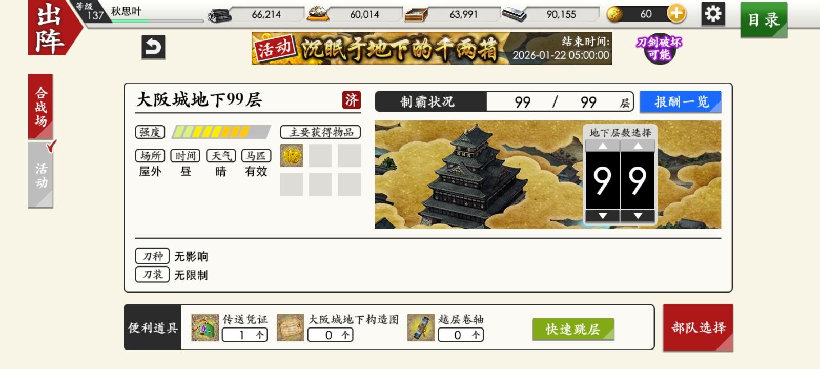 丙子永远的神,两个50+加三个40+的极短直接打过99层,感觉白山掉率好低,打了一天了,一把没掉,接下来就要在99常驻了,想要在活动结束之前捞一把鬼丸和白山,小判打到一百万