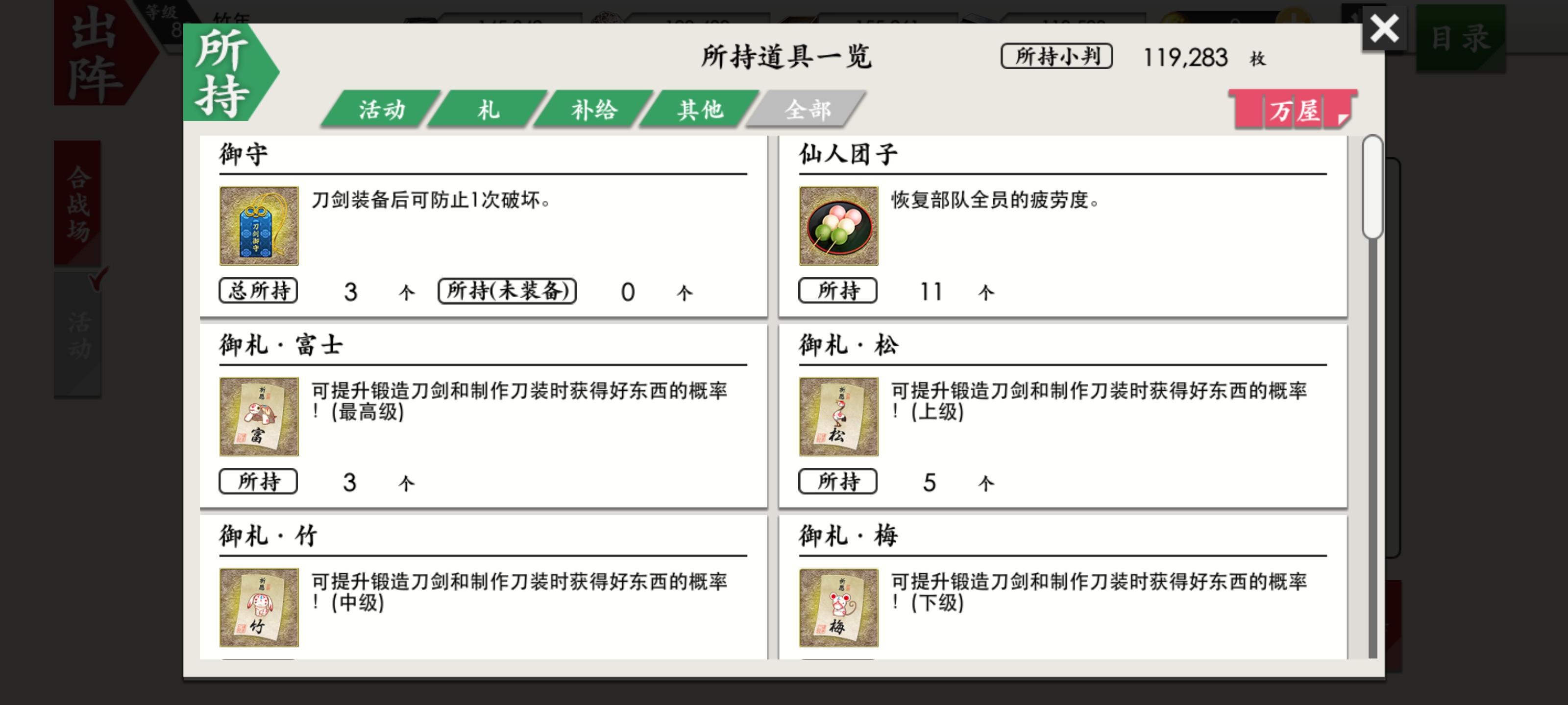 目前小判163.4874w,鬼丸刚好乱舞5,白山差1乱舞8,其他藤四郎都乱9