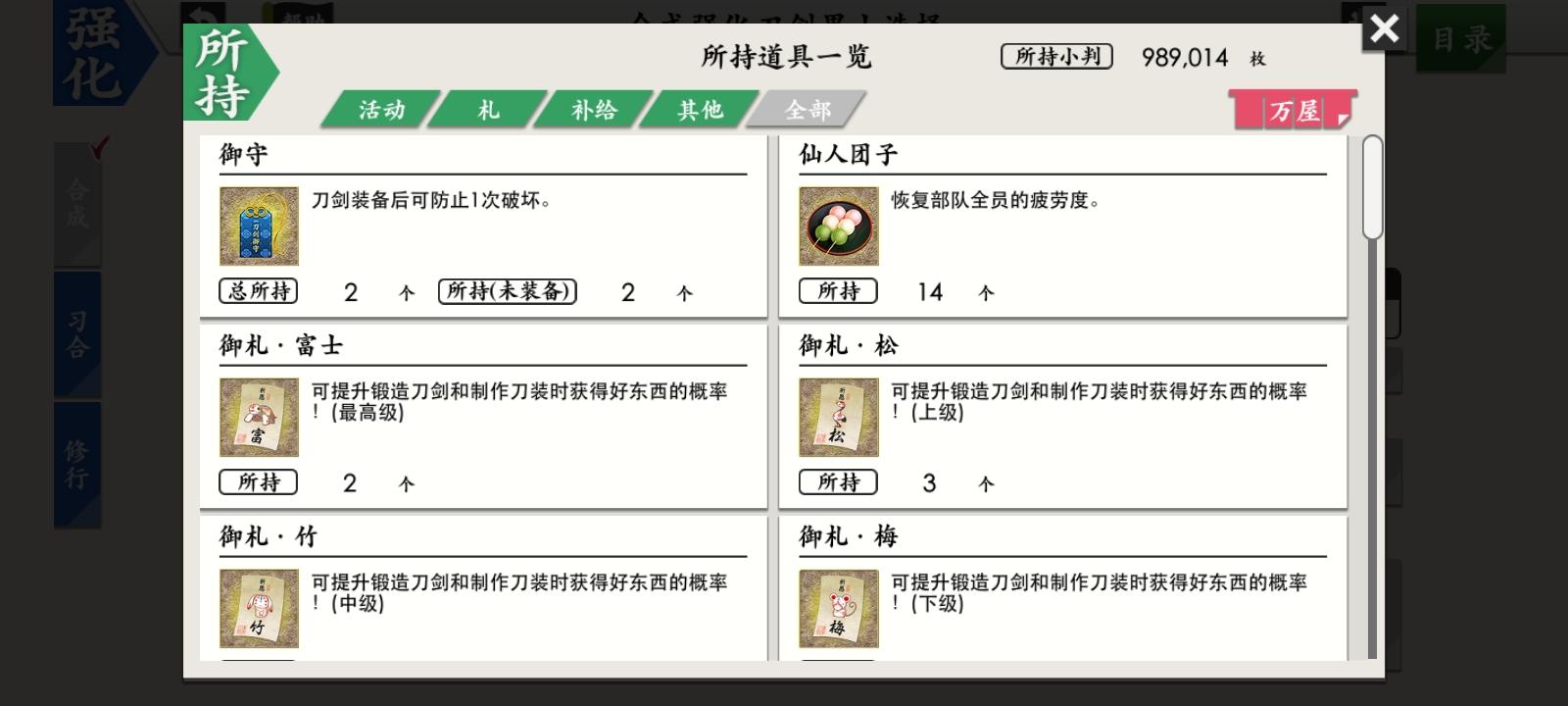 鬼丸到了乱六,白山也到了乱六,小判到了九十八万,因为买了两个景趣花了六万五,不然可以到一百万多万的,还有就是活动不要总是常玩上半时间啊(可能是因为有三倍吧,近乎全天无休),下半段时间开始有一半的时间不打地下城了,下次我一定会全天无休的打地下城
