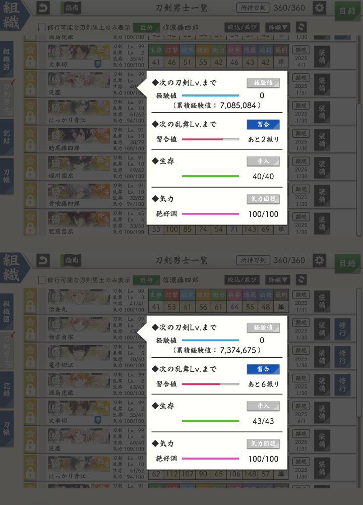 海联没有刷到修行道具,勉勉强强到2.6w ,刚刚打完6图拿到了一套把博多送走了,想着去这次的新活动升级,没想到掉了2把大波若长光,1把南泉一文字,1把太郎太刀,1把岩融,两把物吉贞宗,3把蜻蜓枪,2把浦岛虎彻,不记得几把烛台和狮子王,这个活动掉率是这么高的吗?我已经养好一队99的太刀了,后面的还需要练吗?极短目前只送一个一个,太鼓后藤目前还没有锻出来,活动出来的协差建议升吗?还是升锻出来的笑面青江
