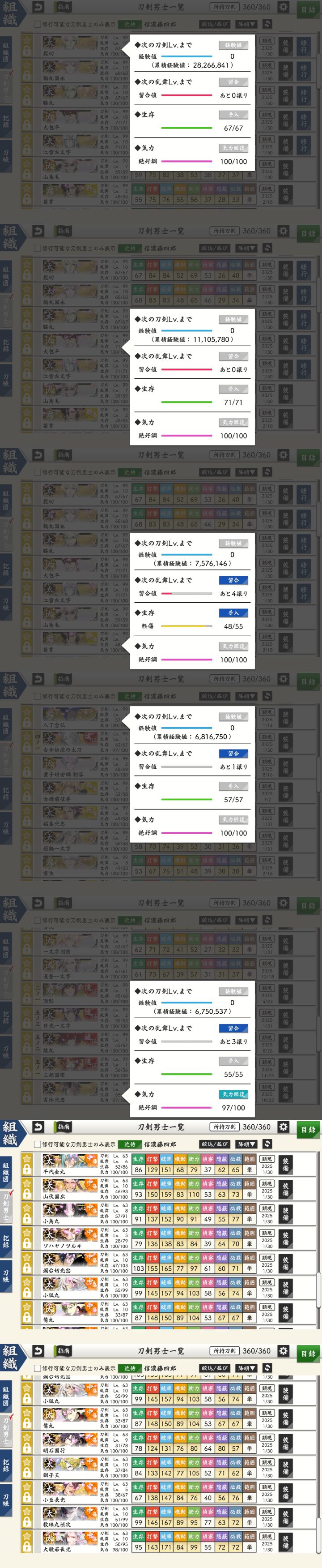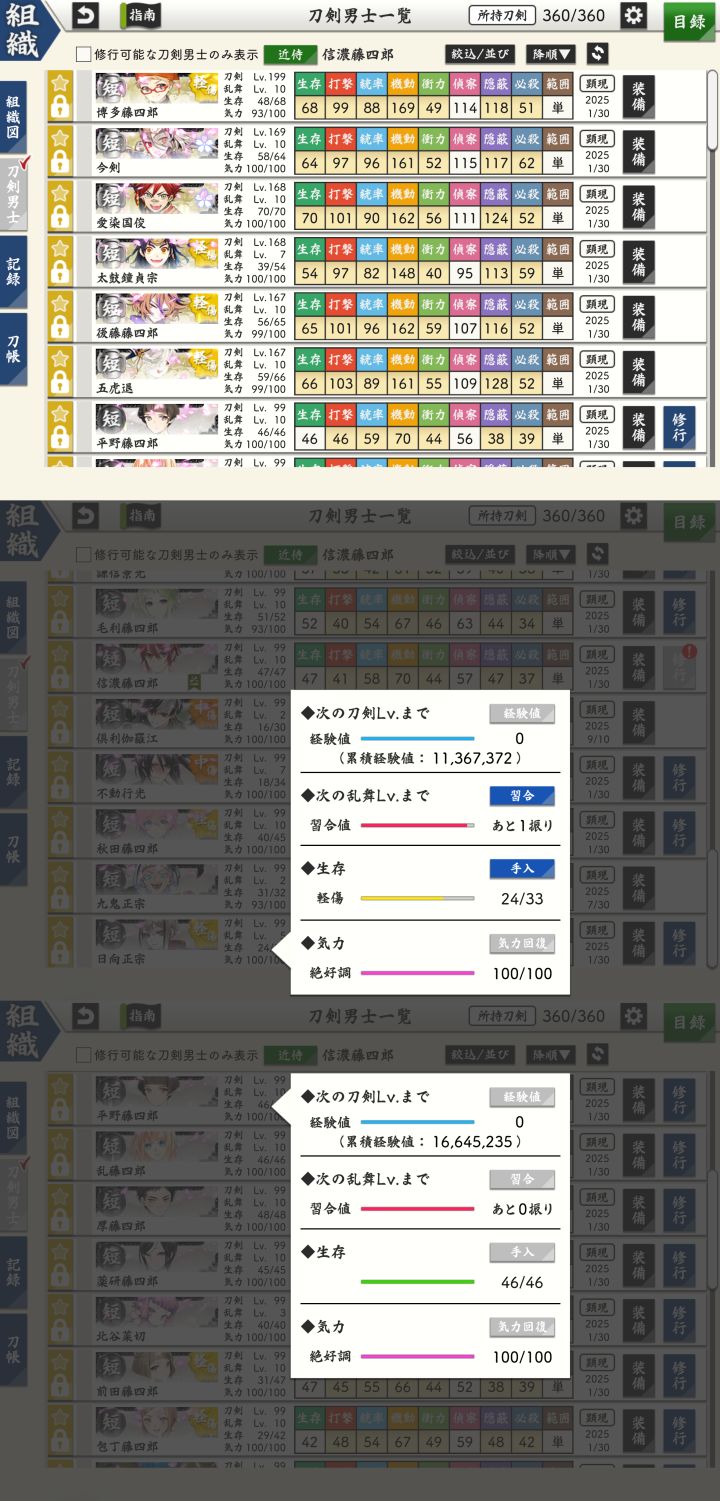 极短,一队够用,练满199再说;普短持续在7-4渡打胁上岸,已全体折合极50极打胁初期在地下城99层搭配练、后期八九十级可在8-2独立运转,普打胁在7-4由普短五带一攒经验至极化后防御能与普99相当再送;极化前后防御值相等时,极前防御越高,极后相当的等级越高,所以乱10打刀都卡着还没送,先练不容易升乱的打刀去了;治金丸回来78级,奶一下今年海联能极化,这样队长位就可以放心交给嗷嗷待哺的二槽三花们