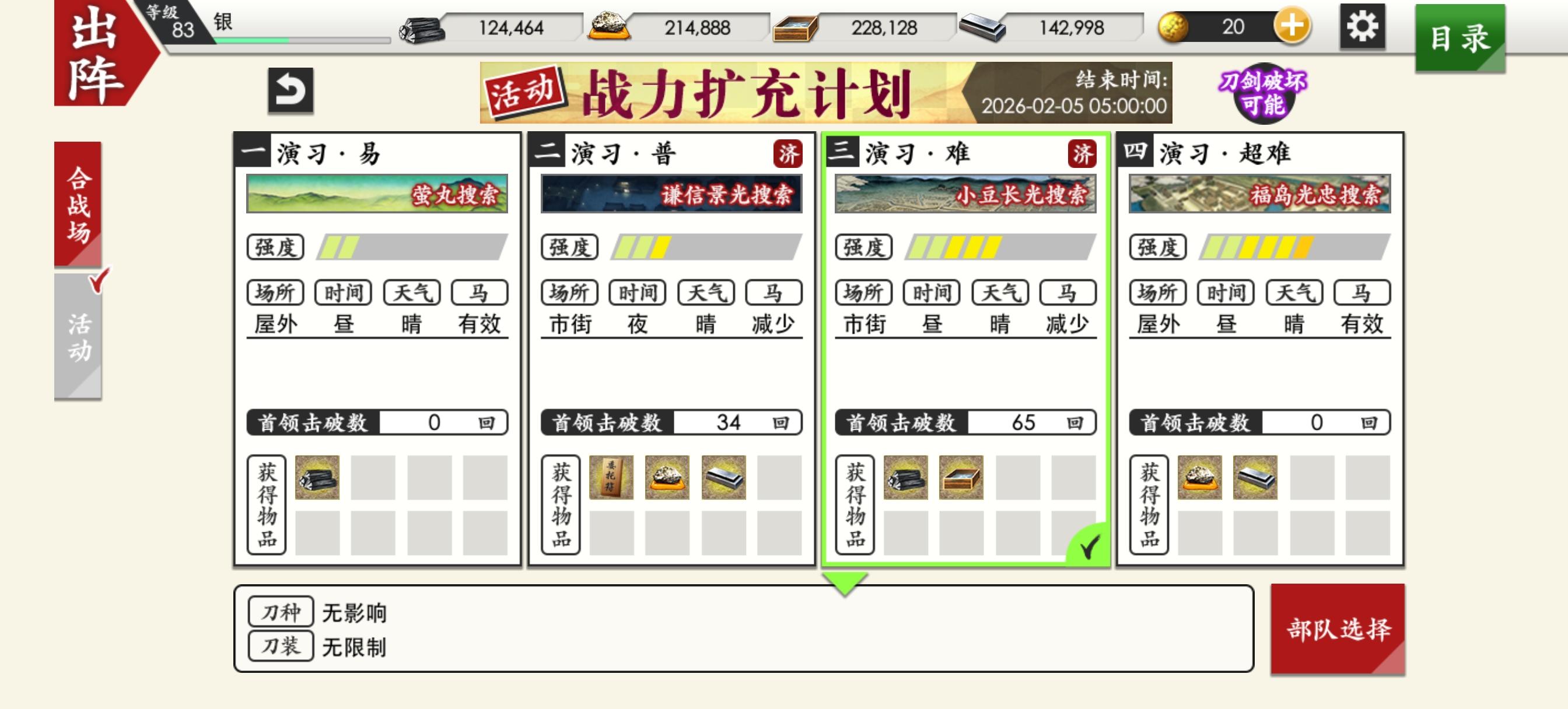 各项资源差值很大,打算通过普图捞资源来配平一下。资源来自活动、任务、远征,普图等等。木炭主要打3-3,砥石看情况可能打3-4或者4-2,配平后打4-3过渡。平时练刀捞刀应该会在5-4,7-3,8-3,8-4之间跑。应该每天都会记录一下资源数。大庆5000积分强娶了,八丁南瓜捞到了,等后面会上线的面影(希望等我攒够了保底再来)。资源数按木炭,玉钢,冷却材,砥石的顺序记录