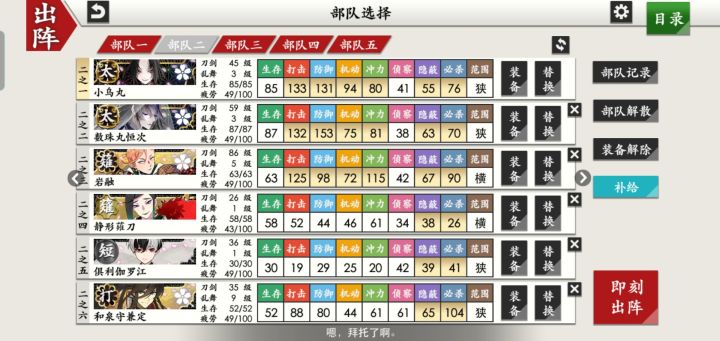 短:小鼓24+87 不动14+44 谦信22 太阁3胁:物吉56+45 泛尘6打:长曾弥38-9 南泉29 太:大菠萝1+58 小豆25 小龙12-9 小狐丸6枪:日本号15+38满乱:大般若,小鼓,不动,号叔,物吉 小龙加强锻刀12w数珠丸2 小乌丸2 小龙 千子2 明石 龟甲2
