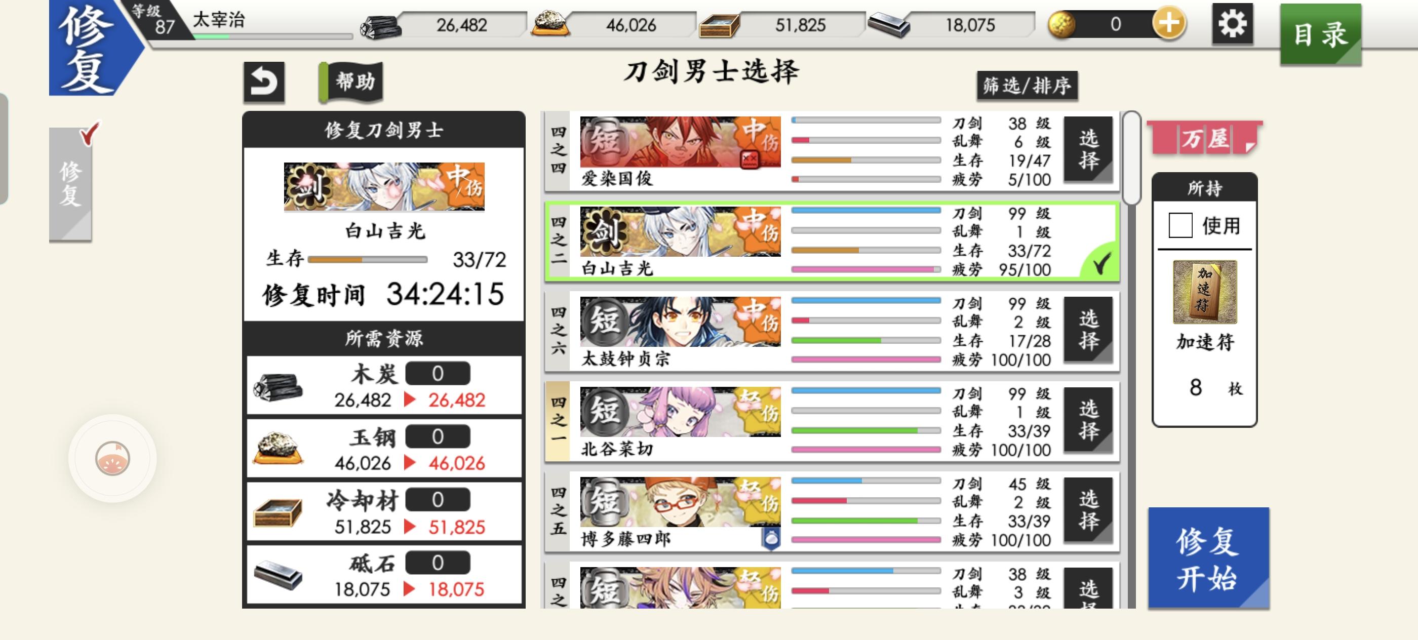 主线8图全推完了(趁着活动还挺方便)这两天加急练短刀刷经验7-4居然都快1000回了(有点肝×)博多极化修行还没回来……练一队极短好难