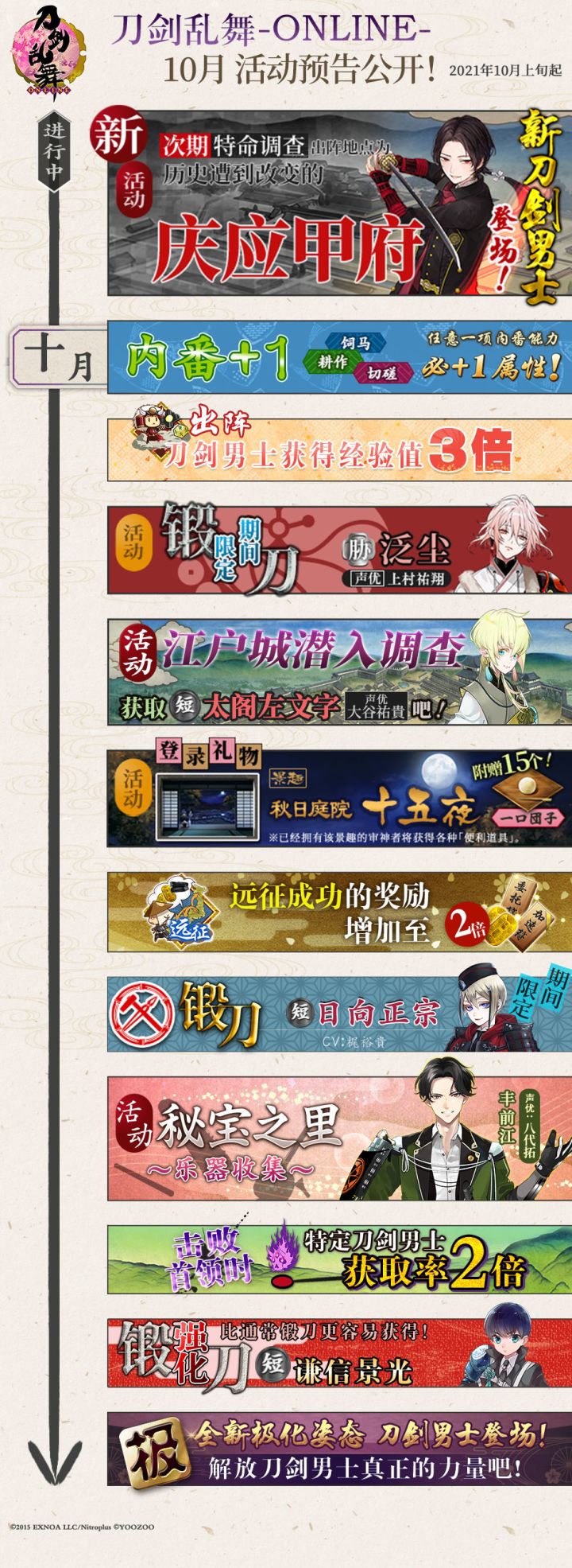 致审神者:《刀剑乱舞-ONLINE-》中文版十月新版本即将开启。3倍经验育成计划开启!「泛尘」期间限定锻刀活动再开!「江户城潜入调查」即将开启!刀剑男士将以全新极化之姿登场! 登录赠「秋日庭院·十五夜」景趣、「日向正宗」期间限定锻刀、「秘宝之里~乐器收集~」等活动也即将上线。更多活动相关详情,敬请留意后续官方情报。以下为《刀剑乱舞-ONLINE-》中文版2021年十月活动预告。